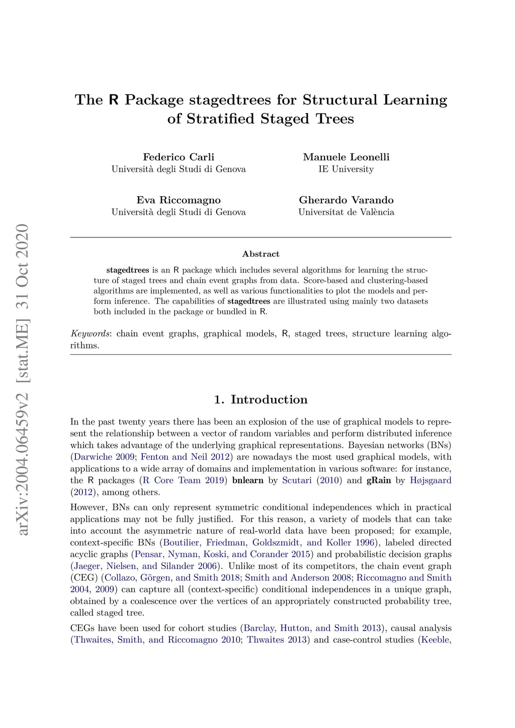 stagedtrees is an R package which includes several algorithms for learning the structure of staged trees and chain event graphs from data. Score-based and clustering-based algorithms are implemented, as well as various functionalities to plot the models and perform inference. The capabilities of stagedtrees are illustrated using mainly two datasets both included in the package or bundled in R.