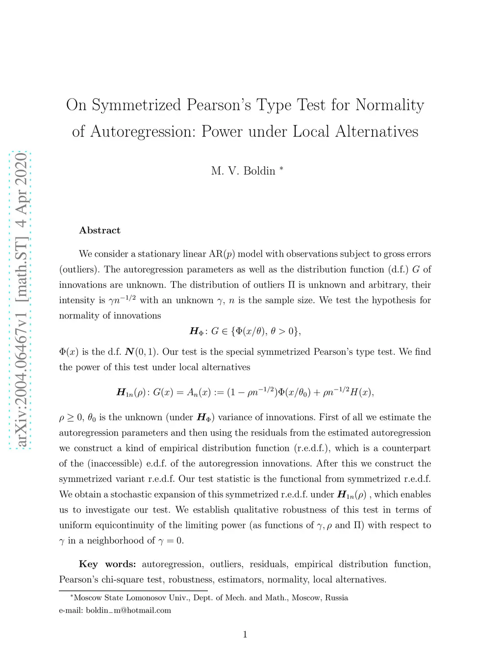 On Symmetrized Pearson's Type Test for Normality of Autoregression: