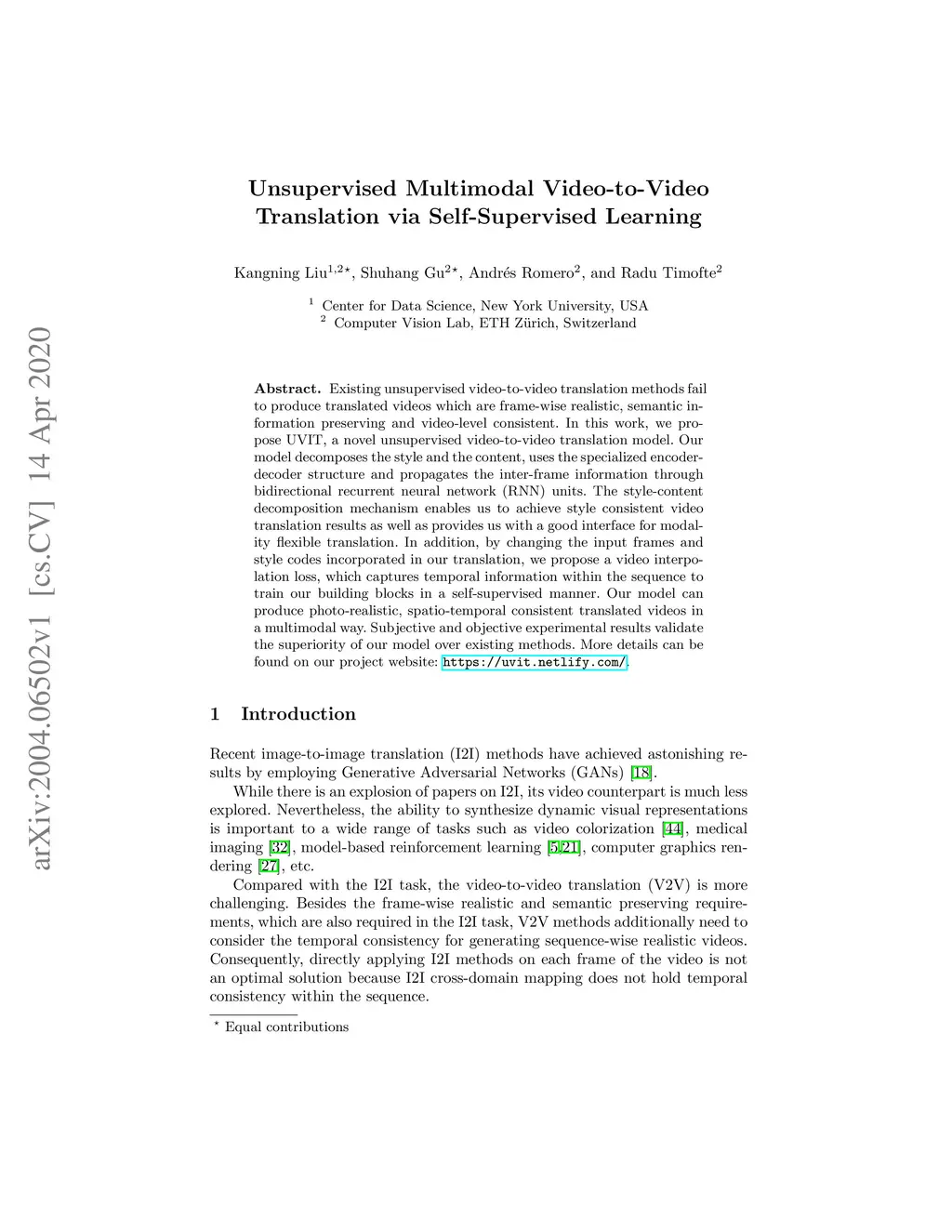 Unsupervised Multimodal Video-to-Video Translation via Self-Supervised