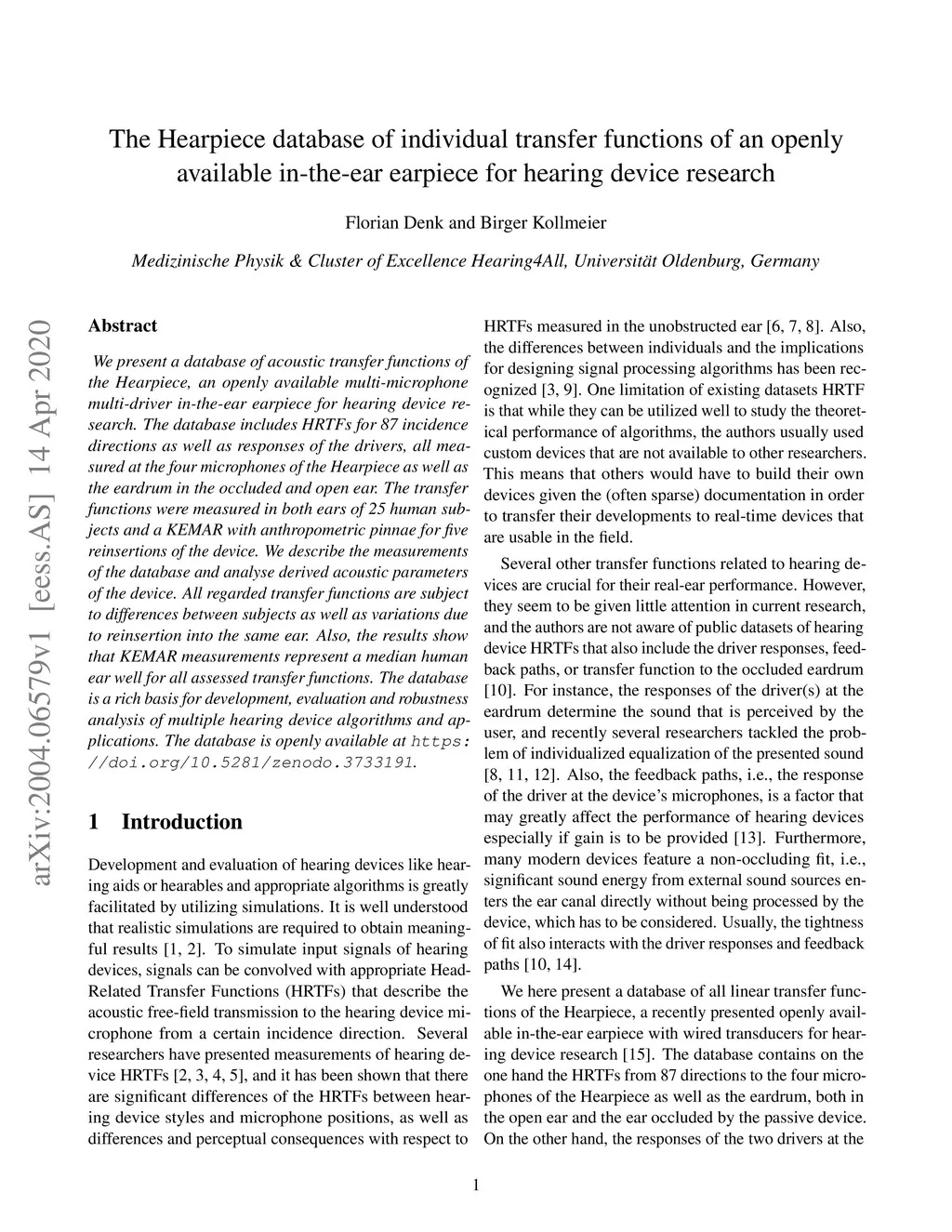 We present a database of acoustic transfer functions of the Hearpiece, an openly available multi-microphone multi-driver in-the-ear earpiece for hearing device research. The database includes HRTFs for 87 incidence directions as well as responses of the drivers, all measured at the four microphones of the Hearpiece as well as the eardrum in the occluded and open ear. The transfer functions were measured in both ears of 25 human subjects and a KEMAR with anthropometric pinnae for five reinsertions of the device. We describe the measurements of the database and analyse derived acoustic parameters of the device. All regarded transfer functions are subject to differences between subjects as well as variations due to reinsertion into the same ear. Also, the results show that KEMAR measurements represent a median human ear well for all assessed transfer functions. The database is a rich basis for development, evaluation and robustness analysis of multiple hearing device algorithms and applications. The database is openly available at https://doi.org/10.5281/zenodo.3733191.