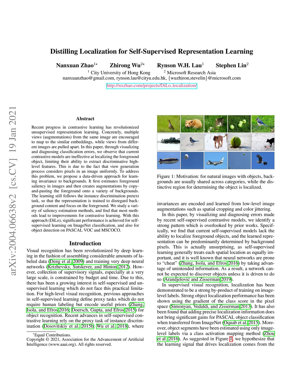 Recent progress in contrastive learning has revolutionized unsupervised representation learning. Concretely, multiple views (augmentations) from the same image are encouraged to map to the similar embeddings, while views from different images are pulled apart. In this paper, through visualizing and diagnosing classification errors, we observe that current contrastive models are ineffective at localizing the foreground object, limiting their ability to extract discriminative high-level features. This is due to the fact that view generation process considers pixels in an image uniformly. To address this problem, we propose a data-driven approach for learning invariance to backgrounds. It first estimates foreground saliency in images and then creates augmentations by copy-and-pasting the foreground onto a variety of backgrounds. The learning still follows the instance discrimination pretext task, so that the representation is trained to disregard background content and focus on the foreground. We study a variety of saliency estimation methods, and find that most methods lead to improvements for contrastive learning. With this approach (DiLo), significant performance is achieved for self-supervised learning on ImageNet classification, and also for object detection on PASCAL VOC and MSCOCO.