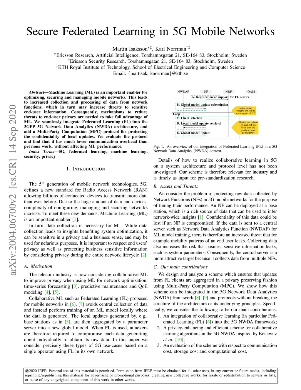 Machine Learning (ML) is an important enabler for optimizing, securing and managing mobile networks. This leads to increased collection and processing of data from network functions, which in turn may increase threats to sensitive end-user information. Consequently, mechanisms to reduce threats to end-user privacy are needed to take full advantage of ML. We seamlessly integrate Federated Learning (FL) into the 3GPP 5G Network Data Analytics (NWDA) architecture, and add a Multi-Party Computation (MPC) protocol for protecting the confidentiality of local updates. We evaluate the protocol and find that it has much lower overhead than previous work, without affecting ML performance.