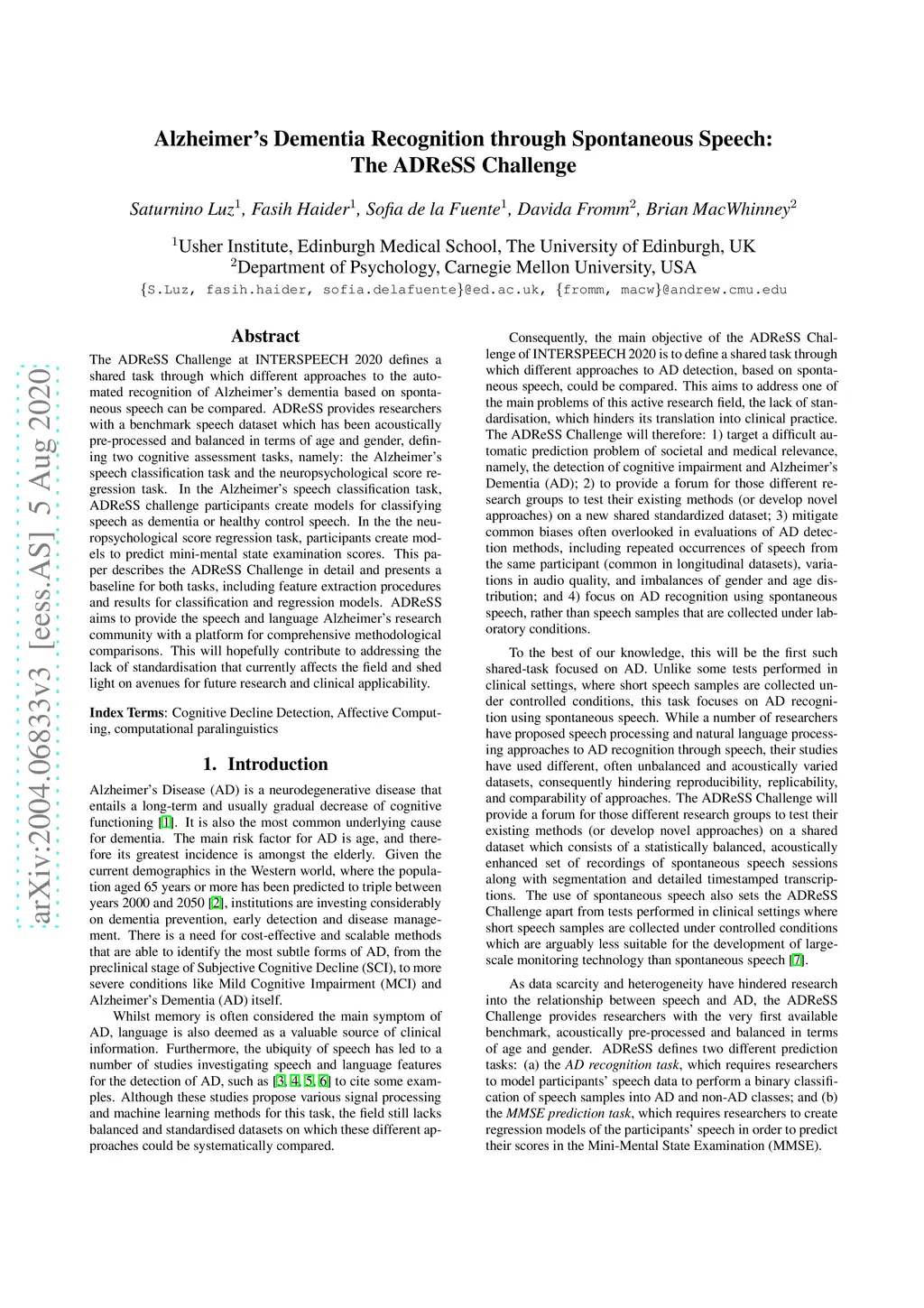 The ADReSS Challenge at INTERSPEECH 2020 defines a shared task through which different approaches to the automated recognition of Alzheimer's dementia based on spontaneous speech can be compared. ADReSS provides researchers with a benchmark speech dataset which has been acoustically pre-processed and balanced in terms of age and gender, defining two cognitive assessment tasks, namely: the Alzheimer's speech classification task and the neuropsychological score regression task. In the Alzheimer's speech classification task, ADReSS challenge participants create models for classifying speech as dementia or healthy control speech. In the the neuropsychological score regression task, participants create models to predict mini-mental state examination scores. This paper describes the ADReSS Challenge in detail and presents a baseline for both tasks, including feature extraction procedures and results for classification and regression models. ADReSS aims to provide the speech and language Alzheimer's research community with a platform for comprehensive methodological comparisons. This will hopefully contribute to addressing the lack of standardisation that currently affects the field and shed light on avenues for future research and clinical applicability.
