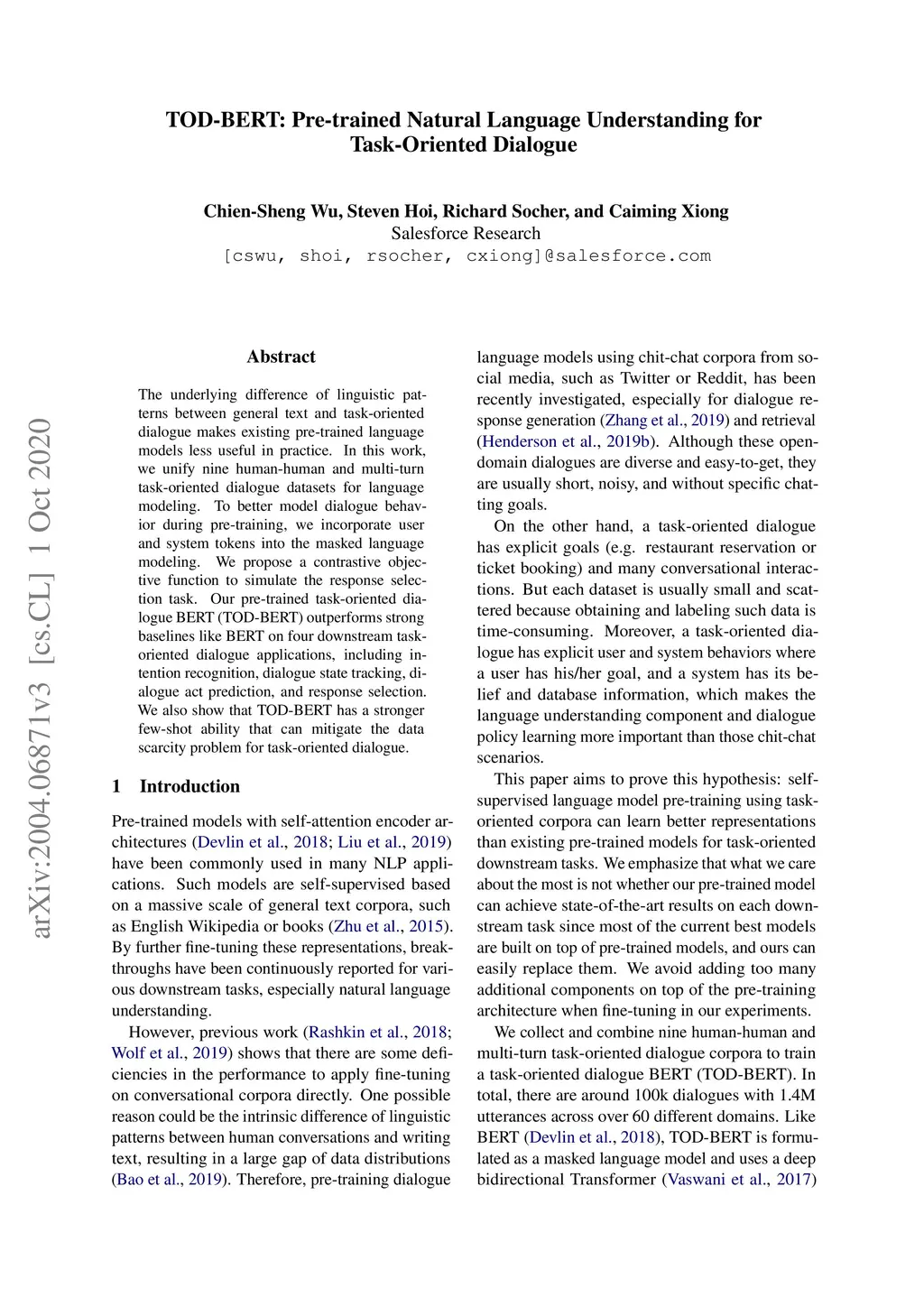 TOD-BERT: Pre-trained Natural Language Understanding for Task-Oriented