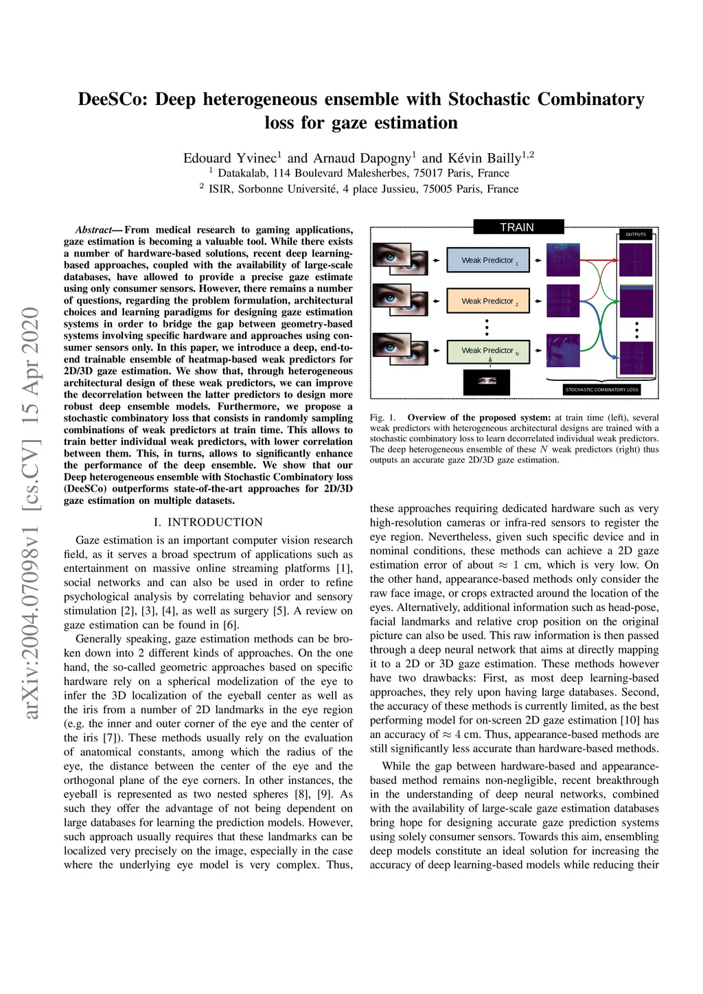 From medical research to gaming applications, gaze estimation is becoming a valuable tool. While there exists a number of hardware-based solutions, recent deep learning-based approaches, coupled with the availability of large-scale databases, have allowed to provide a precise gaze estimate using only consumer sensors. However, there remains a number of questions, regarding the problem formulation, architectural choices and learning paradigms for designing gaze estimation systems in order to bridge the gap between geometry-based systems involving specific hardware and approaches using consumer sensors only. In this paper, we introduce a deep, end-to-end trainable ensemble of heatmap-based weak predictors for 2D/3D gaze estimation. We show that, through heterogeneous architectural design of these weak predictors, we can improve the decorrelation between the latter predictors to design more robust deep ensemble models. Furthermore, we propose a stochastic combinatory loss that consists in randomly sampling combinations of weak predictors at train time. This allows to train better individual weak predictors, with lower correlation between them. This, in turns, allows to significantly enhance the performance of the deep ensemble. We show that our Deep heterogeneous ensemble with Stochastic Combinatory loss (DeeSCo) outperforms state-of-the-art approaches for 2D/3D gaze estimation on multiple datasets.