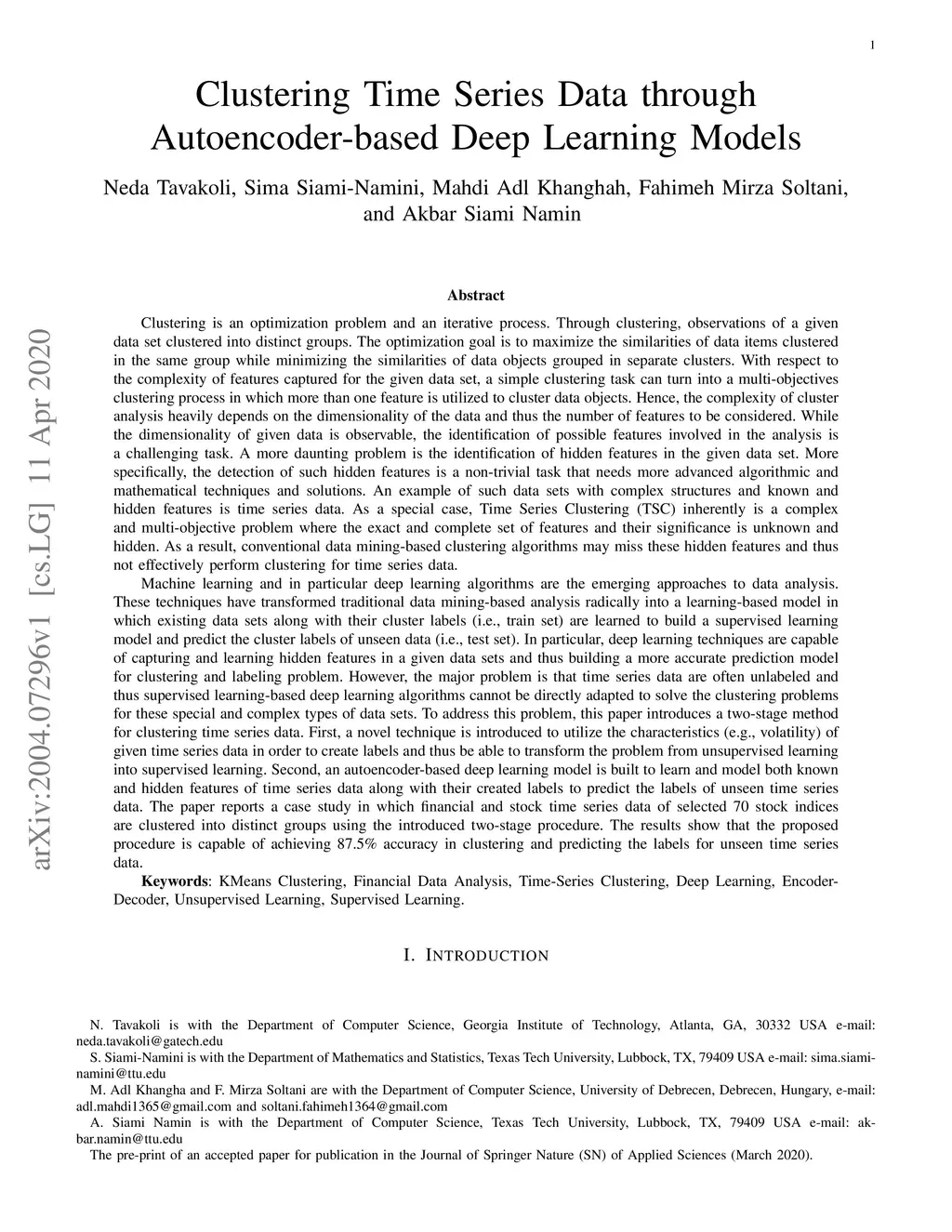 Machine learning and in particular deep learning algorithms are the emerging approaches to data analysis. These techniques have transformed traditional data mining-based analysis radically into a learning-based model in which existing data sets along with their cluster labels (i.e., train set) are learned to build a supervised learning model and predict the cluster labels of unseen data (i.e., test set). In particular, deep learning techniques are capable of capturing and learning hidden features in a given data sets and thus building a more accurate prediction model for clustering and labeling problem. However, the major problem is that time series data are often unlabeled and thus supervised learning-based deep learning algorithms cannot be directly adapted to solve the clustering problems for these special and complex types of data sets. To address this problem, this paper introduces a two-stage method for clustering time series data. First, a novel technique is introduced to utilize the characteristics (e.g., volatility) of given time series data in order to create labels and thus be able to transform the problem from unsupervised learning into supervised learning. Second, an autoencoder-based deep learning model is built to learn and model both known and hidden features of time series data along with their created labels to predict the labels of unseen time series data. The paper reports a case study in which financial and stock time series data of selected 70 stock indices are clustered into distinct groups using the introduced two-stage procedure. The results show that the proposed procedure is capable of achieving 87.5\% accuracy in clustering and predicting the labels for unseen time series data.