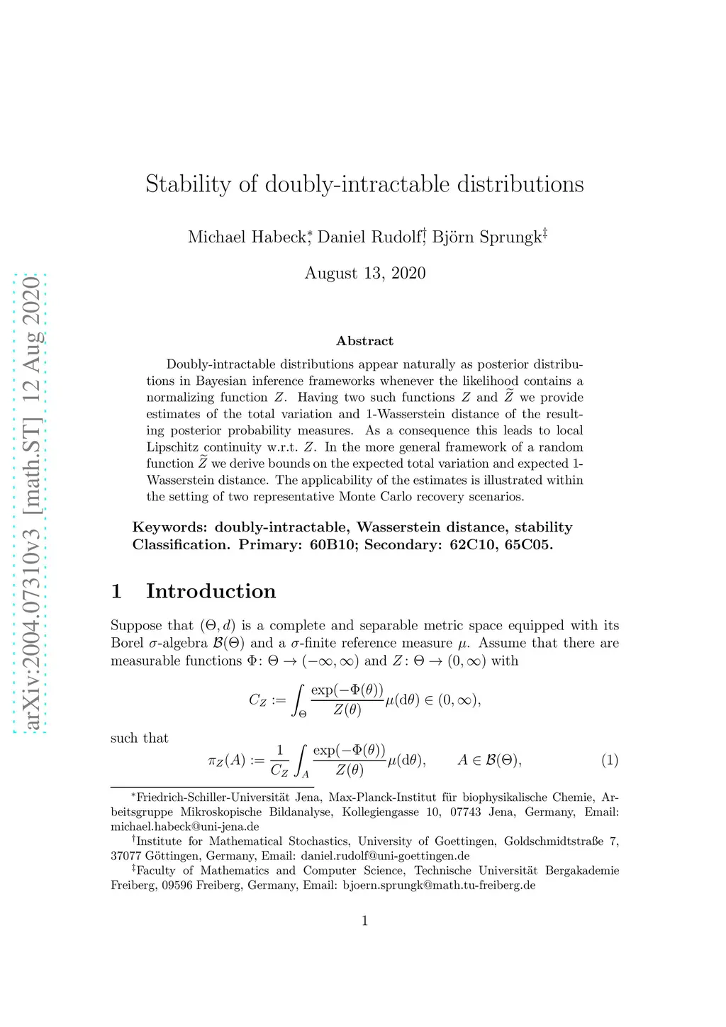 Doubly-intractable distributions appear naturally as posterior distributions in Bayesian inference frameworks whenever the likelihood contains a normalizing function . Having two such functions and we provide estimates of the total variation and Wasserstein distance of the resulting posterior probability measures. As a consequence this leads to local Lipschitz continuity w.r.t. . In the more general framework of a random function we derive bounds on the expected total variation and expected Wasserstein distance. The applicability of the estimates is illustrated within the setting of two representative Monte Carlo recovery scenarios.