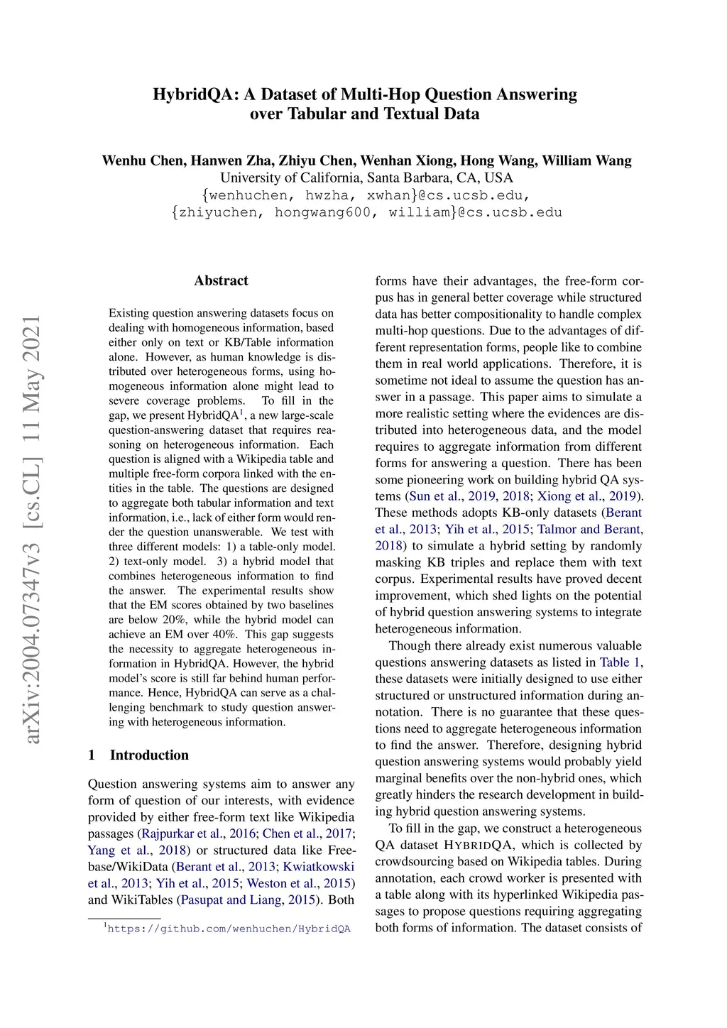 Existing question answering datasets focus on dealing with homogeneous information, based either only on text or KB/Table information alone. However, as human knowledge is distributed over heterogeneous forms, using homogeneous information alone might lead to severe coverage problems. To fill in the gap, we present HybridQA https://github.com/wenhuchen/HybridQA, a new large-scale question-answering dataset that requires reasoning on heterogeneous information. Each question is aligned with a Wikipedia table and multiple free-form corpora linked with the entities in the table. The questions are designed to aggregate both tabular information and text information, i.e., lack of either form would render the question unanswerable. We test with three different models: 1) a table-only model. 2) text-only model. 3) a hybrid model that combines heterogeneous information to find the answer. The experimental results show that the EM scores obtained by two baselines are below 20\%, while the hybrid model can achieve an EM over 40\%. This gap suggests the necessity to aggregate heterogeneous information in HybridQA. However, the hybrid model's score is still far behind human performance. Hence, HybridQA can serve as a challenging benchmark to study question answering with heterogeneous information.