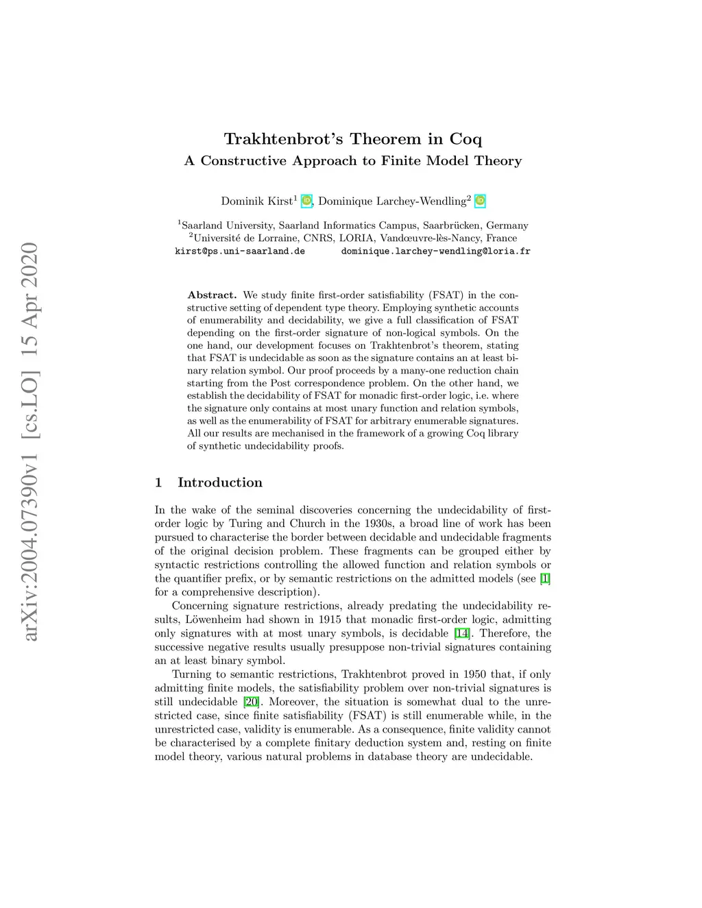 We study finite first-order satisfiability (FSAT) in the constructive setting of dependent type theory. Employing synthetic accounts of enumerability and decidability, we give a full classification of FSAT depending on the first-order signature of non-logical symbols. On the one hand, our development focuses on Trakhtenbrot's theorem, stating that FSAT is undecidable as soon as the signature contains an at least binary relation symbol. Our proof proceeds by a many-one reduction chain starting from the Post correspondence problem. On the other hand, we establish the decidability of FSAT for monadic first-order logic, i.e. where the signature only contains at most unary function and relation symbols, as well as the enumerability of FSAT for arbitrary enumerable signatures. All our results are mechanised in the framework of a growing Coq library of synthetic undecidability proofs.