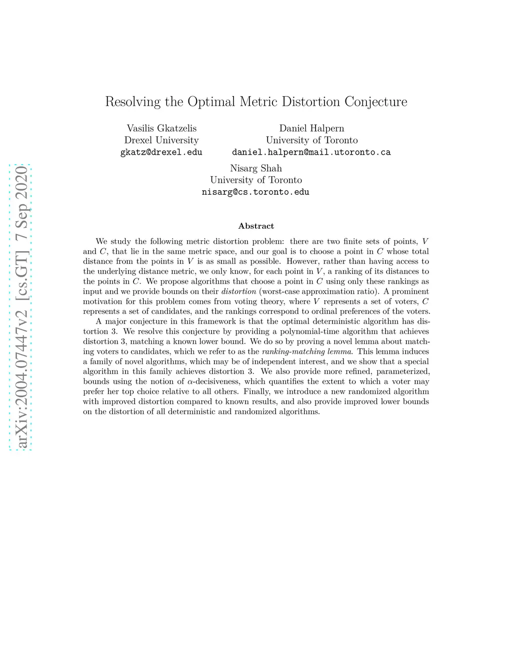We study the following metric distortion problem: there are two finite sets of points, and , that lie in the same metric space, and our goal is to choose a point in whose total distance from the points in is as small as possible. However, rather than having access to the underlying distance metric, we only know, for each point in , a ranking of its distances to the points in . We propose algorithms that choose a point in using only these rankings as input and we provide bounds on their \emph{distortion} (worst-case approximation ratio). A prominent motivation for this problem comes from voting theory, where represents a set of voters, represents a set of candidates, and the rankings correspond to ordinal preferences of the voters. A major conjecture in this framework is that the optimal deterministic algorithm has distortion . We resolve this conjecture by providing a polynomial-time algorithm that achieves distortion , matching a known lower bound. We do so by proving a novel lemma about matching voters to candidates, which we refer to as the \emph{ranking-matching lemma}. This lemma induces a family of novel algorithms, which may be of independent interest, and we show that a special algorithm in this family achieves distortion . We also provide more refined, parameterized, bounds using the notion of -decisiveness, which quantifies the extent to which a voter may prefer her top choice relative to all others. Finally, we introduce a new randomized algorithm with improved distortion compared to known results, and also provide improved lower bounds on the distortion of all deterministic and randomized algorithms.