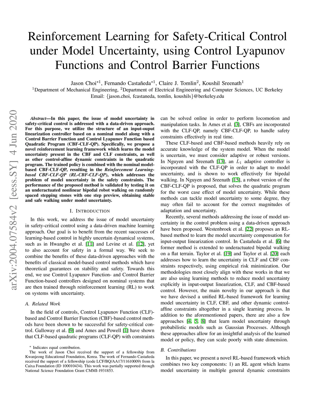 In this paper, the issue of model uncertainty in safety-critical control is addressed with a data-driven approach. For this purpose, we utilize a structure of an input-ouput linearization controller based on a nominal model, and Control Barrier Function (CBF) and Control Lyapunov Function (CLF)-based control methods. Specifically, a novel Reinforcement Learning framework which learns the model uncertainty in CBF and CLF constraints, as well as other dynamic constraints is proposed. The trained policy is combined with the nominal model-based CBF-CLF-QP, resulting in the Reinforcement Learning based CBF-CLF-QP (RL-CBF-CLF-QP), which now addresses the problem of uncertainty in the safety constraints. The performance of the proposed method is validated by testing it on an underactuated nonlinear bipedal robot walking on randomly spaced stepping stones with one step preview.