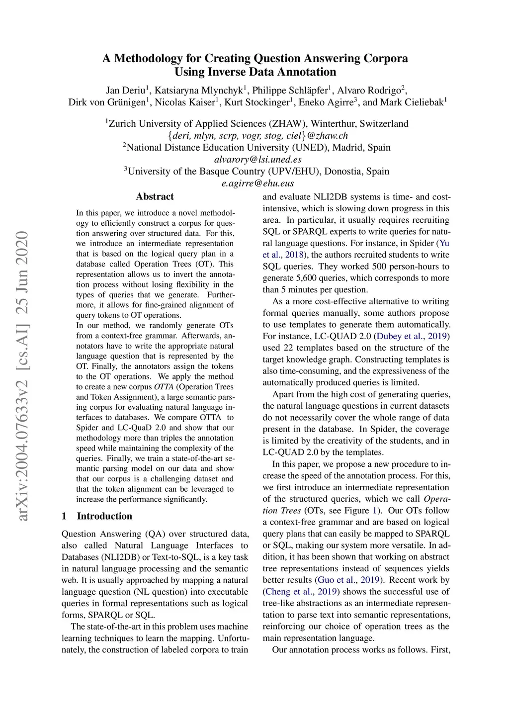In this paper, we introduce a novel methodology to efficiently construct a corpus for question answering over structured data. For this, we introduce an intermediate representation that is based on the logical query plan in a database called Operation Trees (OT). This representation allows us to invert the annotation process without losing flexibility in the types of queries that we generate. Furthermore, it allows for fine-grained alignment of query tokens to OT operations. In our method, we randomly generate OTs from a context-free grammar. Afterwards, annotators have to write the appropriate natural language question that is represented by the OT. Finally, the annotators assign the tokens to the OT operations. We apply the method to create a new corpus OTTA (Operation Trees and Token Assignment), a large semantic parsing corpus for evaluating natural language interfaces to databases. We compare OTTA to Spider and LC-QuaD 2.0 and show that our methodology more than triples the annotation speed while maintaining the complexity of the queries. Finally, we train a state-of-the-art semantic parsing model on our data and show that our corpus is a challenging dataset and that the token alignment can be leveraged to increase the performance significantly.