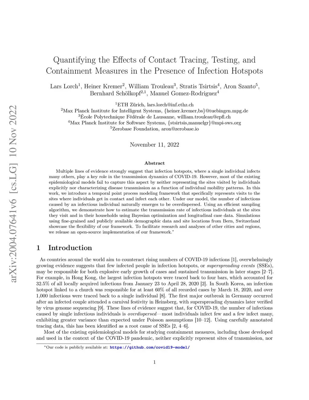 Multiple lines of evidence strongly suggest that infection hotspots, where a single individual infects many others, play a key role in the transmission dynamics of COVID-19. However, most of the existing epidemiological models fail to capture this aspect by neither representing the sites visited by individuals explicitly nor characterizing disease transmission as a function of individual mobility patterns. In this work, we introduce a temporal point process modeling framework that specifically represents visits to the sites where individuals get in contact and infect each other. Under our model, the number of infections caused by an infectious individual naturally emerges to be overdispersed. Using an efficient sampling algorithm, we demonstrate how to estimate the transmission rate of infectious individuals at the sites they visit and in their households using Bayesian optimization and longitudinal case data. Simulations using fine-grained and publicly available demographic data and site locations from Bern, Switzerland showcase the flexibility of our framework. To facilitate research and analyses of other cities and regions, we release an open-source implementation of our framework.