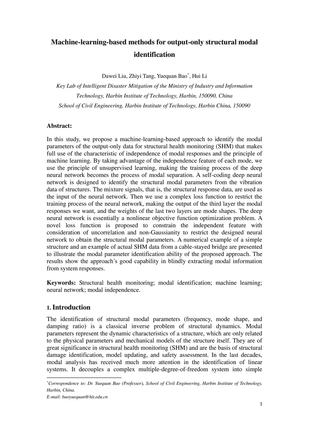 In this study, we propose a machine-learning-based approach to identify the modal parameters of the output-only data for structural health monitoring (SHM) that makes full use of the characteristic of independence of modal responses and the principle of machine learning. By taking advantage of the independence feature of each mode, we use the principle of unsupervised learning, making the training process of the deep neural network becomes the process of modal separation. A self-coding deep neural network is designed to identify the structural modal parameters from the vibration data of structures. The mixture signals, that is, the structural response data, are used as the input of the neural network. Then we use a complex loss function to restrict the training process of the neural network, making the output of the third layer the modal responses we want, and the weights of the last two layers are mode shapes. The deep neural network is essentially a nonlinear objective function optimization problem. A novel loss function is proposed to constrain the independent feature with consideration of uncorrelation and non-Gaussianity to restrict the designed neural network to obtain the structural modal parameters. A numerical example of a simple structure and an example of actual SHM data from a cable-stayed bridge are presented to illustrate the modal parameter identification ability of the proposed approach. The results show the approach's good capability in blindly extracting modal information from system responses.