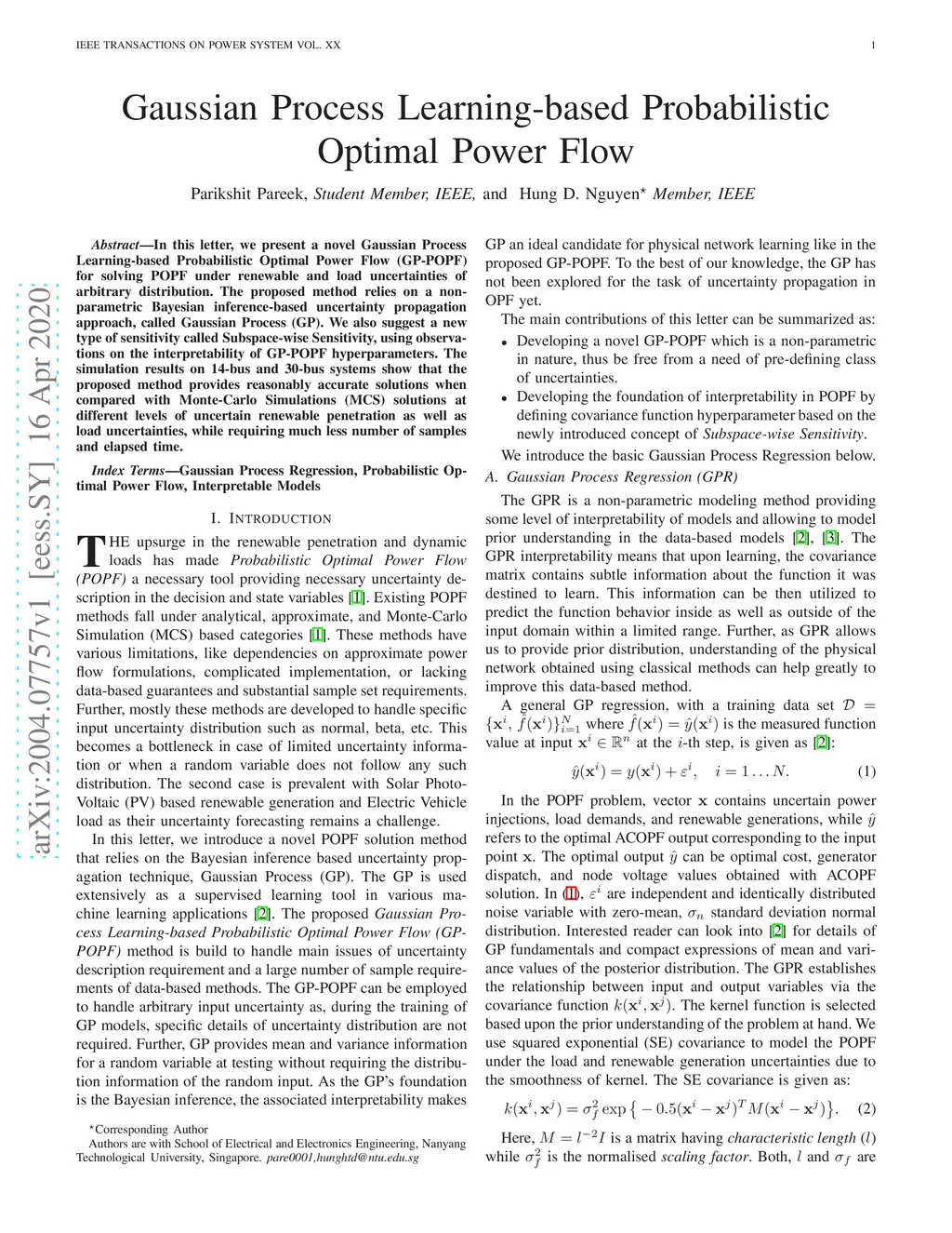 In this letter, we present a novel Gaussian Process Learning-based Probabilistic Optimal Power Flow (GP-POPF) for solving POPF under renewable and load uncertainties of arbitrary distribution. The proposed method relies on a non-parametric Bayesian inference-based uncertainty propagation approach, called Gaussian Process (GP). We also suggest a new type of sensitivity called Subspace-wise Sensitivity, using observations on the interpretability of GP-POPF hyperparameters. The simulation results on 14-bus and 30-bus systems show that the proposed method provides reasonably accurate solutions when compared with Monte-Carlo Simulations (MCS) solutions at different levels of uncertain renewable penetration as well as load uncertainties, while requiring much less number of samples and elapsed time.