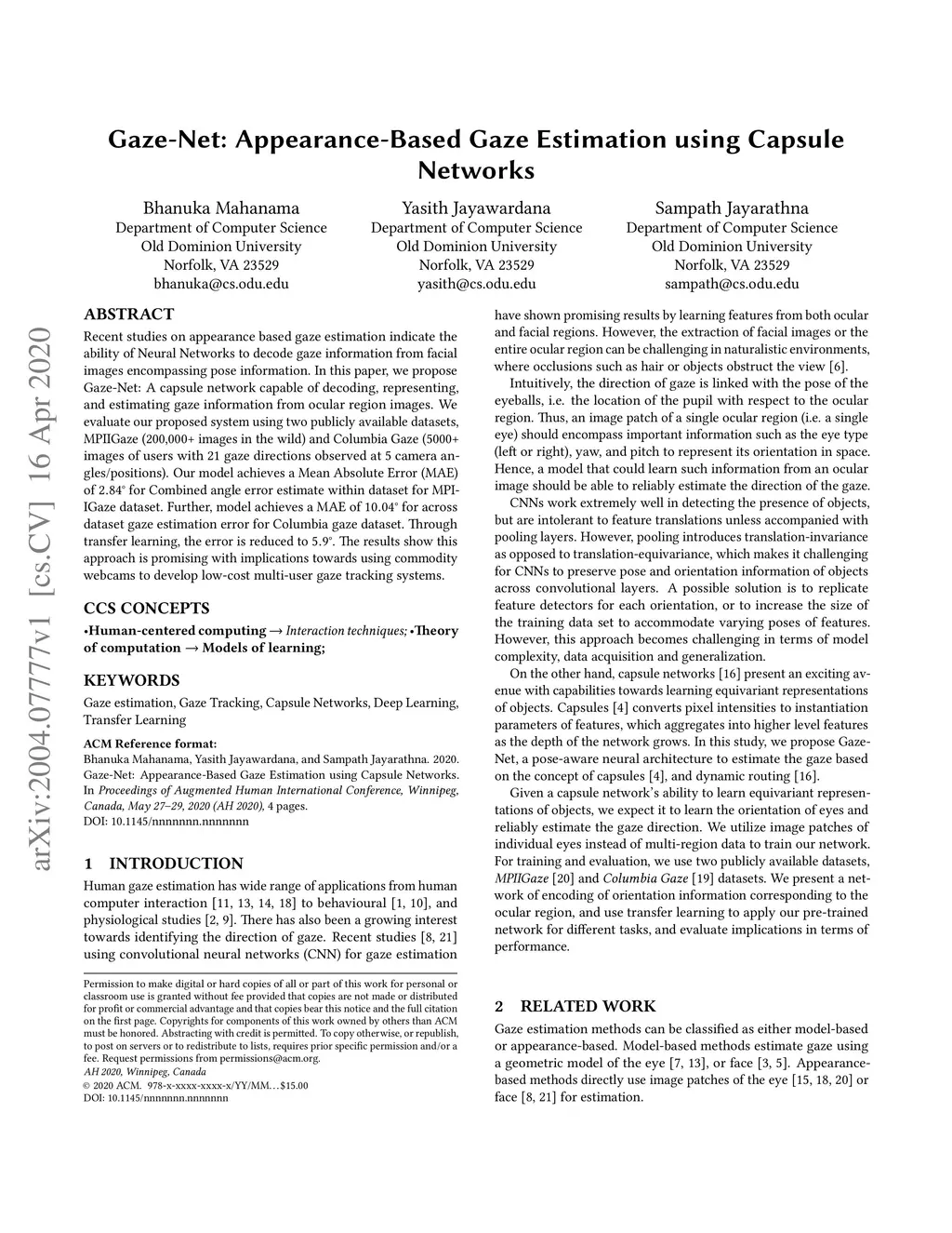Gaze-Net: Appearance-Based Gaze Estimation using Capsule Networks