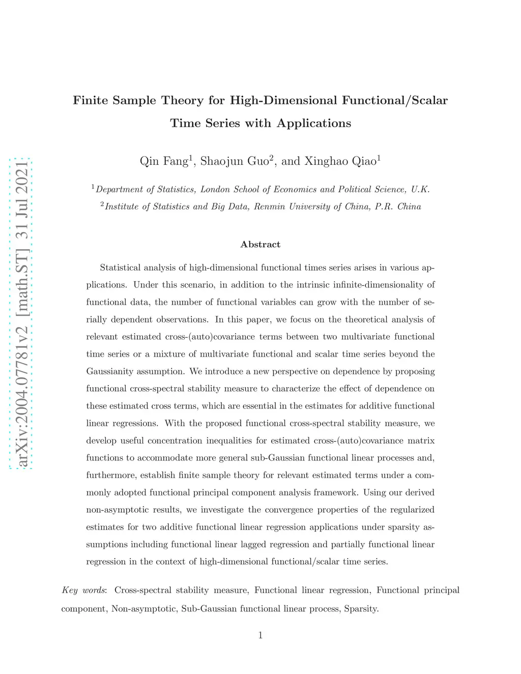Statistical analysis of high-dimensional functional times series arises in various applications. Under this scenario, in addition to the intrinsic infinite-dimensionality of functional data, the number of functional variables can grow with the number of serially dependent observations. In this paper, we focus on the theoretical analysis of relevant estimated cross-(auto)covariance terms between two multivariate functional time series or a mixture of multivariate functional and scalar time series beyond the Gaussianity assumption. We introduce a new perspective on dependence by proposing functional cross-spectral stability measure to characterize the effect of dependence on these estimated cross terms, which are essential in the estimates for additive functional linear regressions. With the proposed functional cross-spectral stability measure, we develop useful concentration inequalities for estimated cross-(auto)covariance matrix functions to accommodate more general sub-Gaussian functional linear processes and, furthermore, establish finite sample theory for relevant estimated terms under a commonly adopted functional principal component analysis framework. Using our derived non-asymptotic results, we investigate the convergence properties of the regularized estimates for two additive functional linear regression applications under sparsity assumptions including functional linear lagged regression and partially functional linear regression in the context of high-dimensional functional/scalar time series.