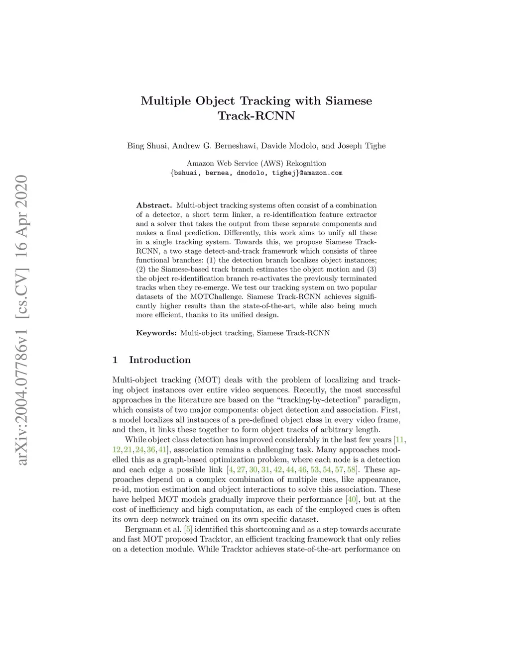 Multi-object tracking systems often consist of a combination of a detector, a short term linker, a re-identification feature extractor and a solver that takes the output from these separate components and makes a final prediction. Differently, this work aims to unify all these in a single tracking system. Towards this, we propose Siamese Track-RCNN, a two stage detect-and-track framework which consists of three functional branches: (1) the detection branch localizes object instances; (2) the Siamese-based track branch estimates the object motion and (3) the object re-identification branch re-activates the previously terminated tracks when they re-emerge. We test our tracking system on two popular datasets of the MOTChallenge. Siamese Track-RCNN achieves significantly higher results than the state-of-the-art, while also being much more efficient, thanks to its unified design.