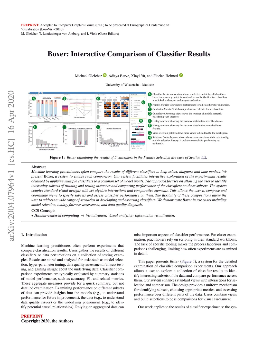 Machine learning practitioners often compare the results of different classifiers to help select, diagnose and tune models. We present Boxer, a system to enable such comparison. Our system facilitates interactive exploration of the experimental results obtained by applying multiple classifiers to a common set of model inputs. The approach focuses on allowing the user to identify interesting subsets of training and testing instances and comparing performance of the classifiers on these subsets. The system couples standard visual designs with set algebra interactions and comparative elements. This allows the user to compose and coordinate views to specify subsets and assess classifier performance on them. The flexibility of these compositions allow the user to address a wide range of scenarios in developing and assessing classifiers. We demonstrate Boxer in use cases including model selection, tuning, fairness assessment, and data quality diagnosis.