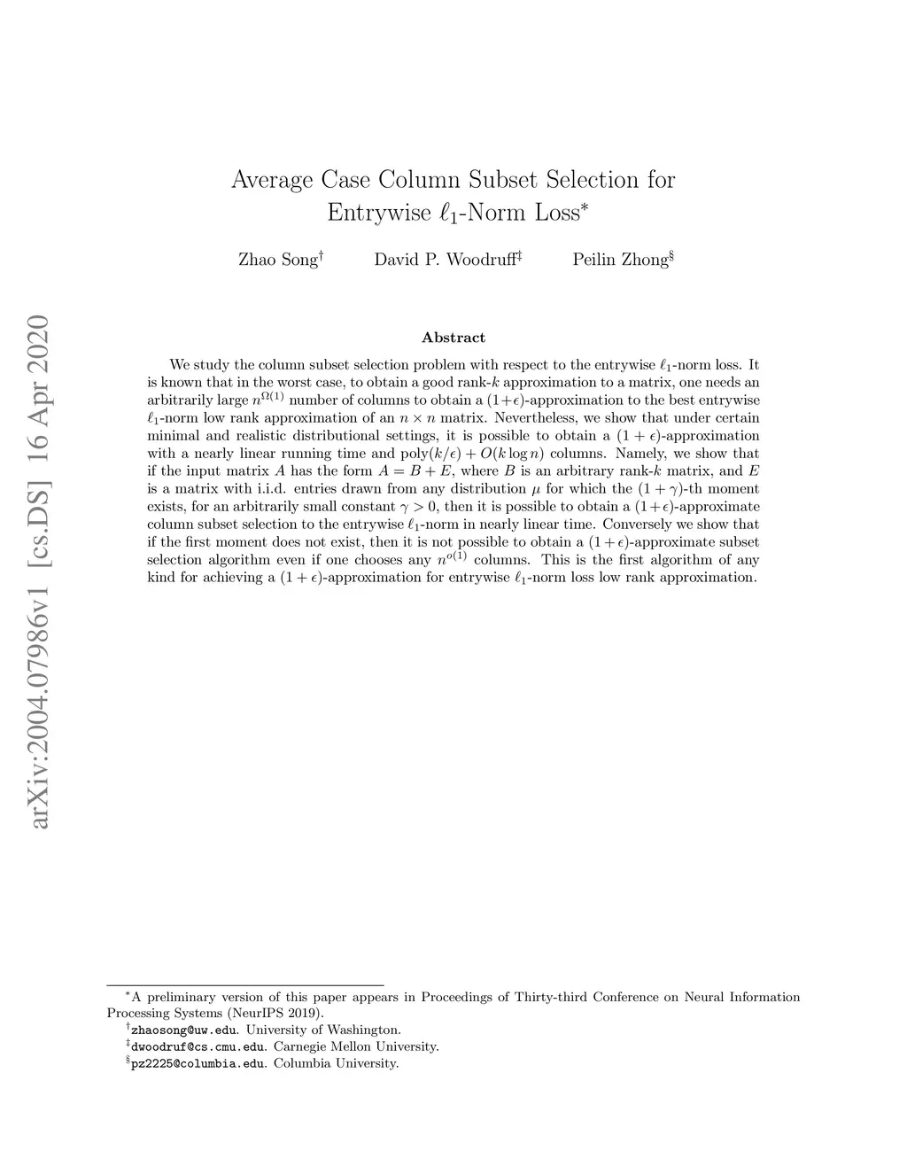 We study the column subset selection problem with respect to the entrywise -norm loss. It is known that in the worst case, to obtain a good rank- approximation to a matrix, one needs an arbitrarily large number of columns to obtain a -approximation to the best entrywise -norm low rank approximation of an matrix. Nevertheless, we show that under certain minimal and realistic distributional settings, it is possible to obtain a -approximation with a nearly linear running time and poly columns. Namely, we show that if the input matrix has the form , where is an arbitrary rank- matrix, and is a matrix with i.i.d. entries drawn from any distribution for which the -th moment exists, for an arbitrarily small constant , then it is possible to obtain a -approximate column subset selection to the entrywise -norm in nearly linear time. Conversely we show that if the first moment does not exist, then it is not possible to obtain a -approximate subset selection algorithm even if one chooses any columns. This is the first algorithm of any kind for achieving a -approximation for entrywise -norm loss low rank approximation.