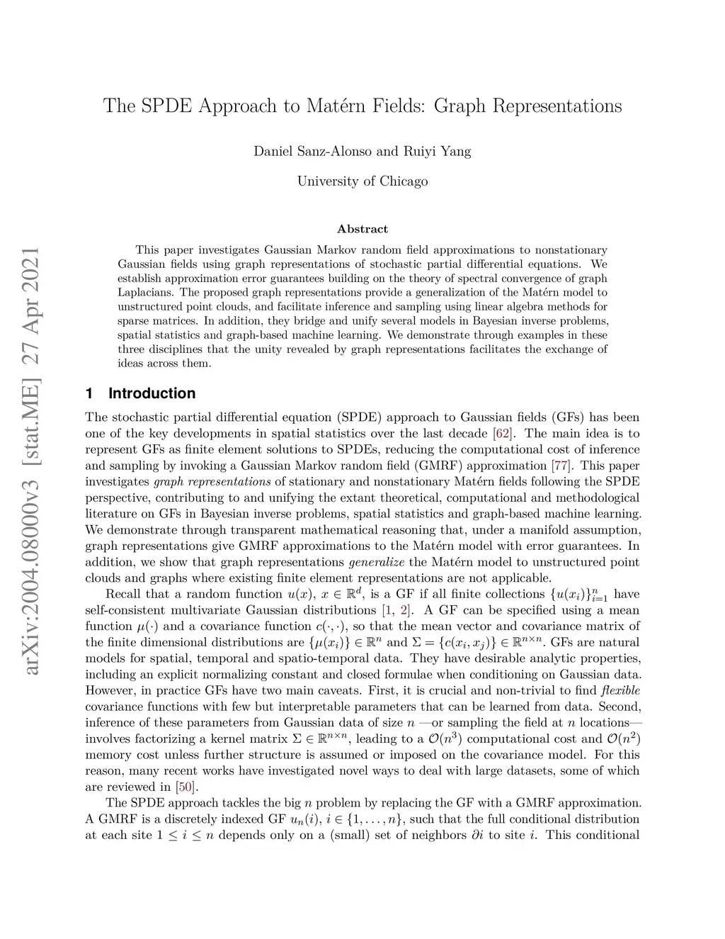 This paper investigates Gaussian Markov random field approximations to nonstationary Gaussian fields using graph representations of stochastic partial differential equations. We establish approximation error guarantees building on and generalizing the theory of spectral convergence of graph Laplacians. Graph representations allow inference and sampling with linear algebra methods for sparse matrices, thus reducing the computational cost. In addition, they bridge and unify several models in Bayesian inverse problems, spatial statistics and graph-based machine learning. We demonstrate through examples in these three disciplines that the unity revealed by graph representations facilitates the exchange of ideas across them.