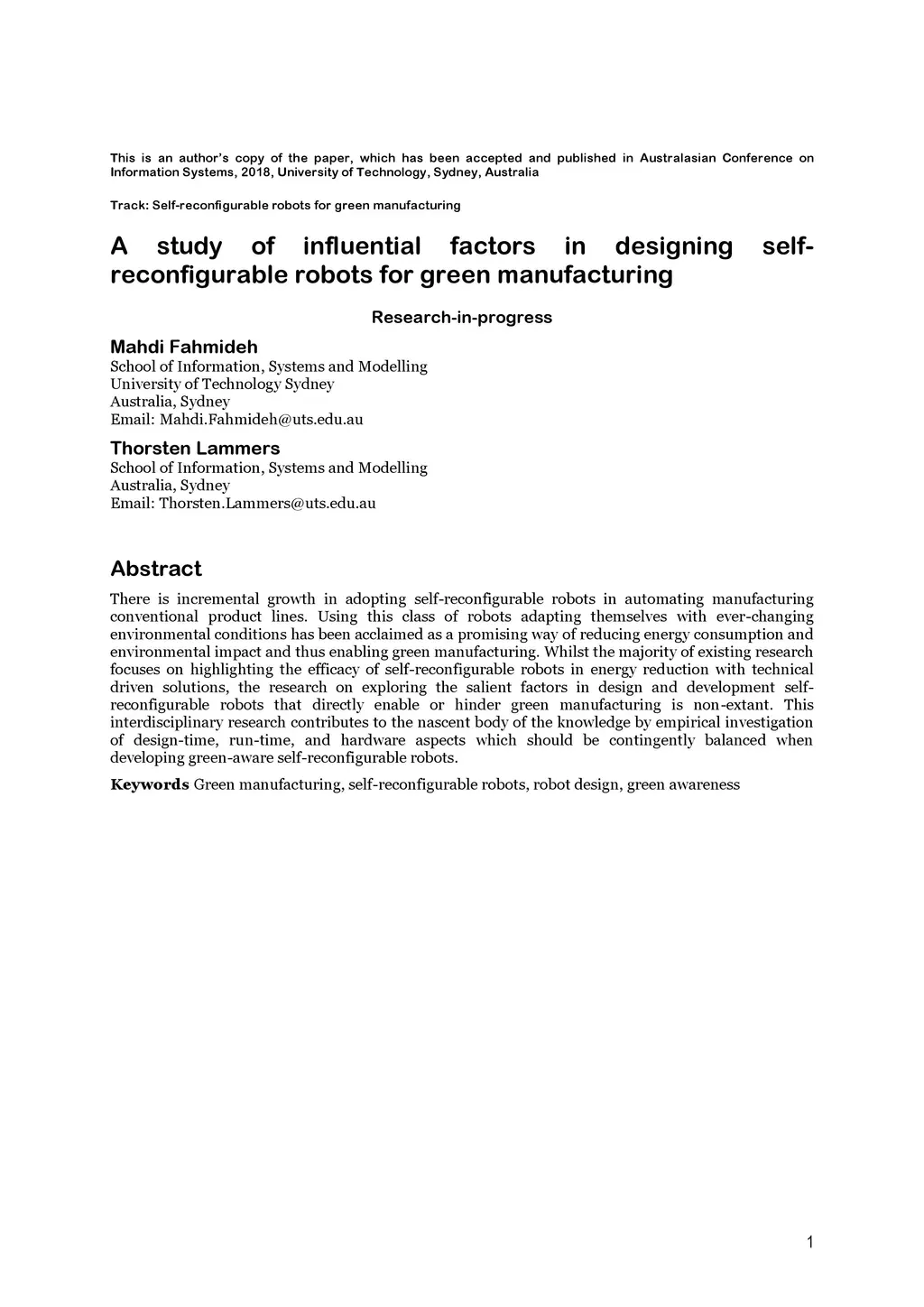 There is incremental growth in adopting self-reconfigurable robots in automating manufacturing conventional product lines. Using this class of robots adapting themselves with ever-changing environmental conditions has been acclaimed as a promising way of reducing energy consumption and environmental impact and thus enabling green manufacturing. Whilst the majority of existing research focuses on highlighting the efficacy of self-reconfigurable robots in energy reduction with technical driven solutions, the research on exploring the salient factors in design and development self-reconfigurable robots that directly enable or hinder green manufacturing is non-extant. This interdisciplinary research contributes to the nascent body of the knowledge by empirical investigation of design-time, run-time, and hardware aspects which should be contingently balanced when developing green-aware self-reconfigurable robots. Keywords Green manufacturing, self-reconfigurable robots, robot design, green awareness