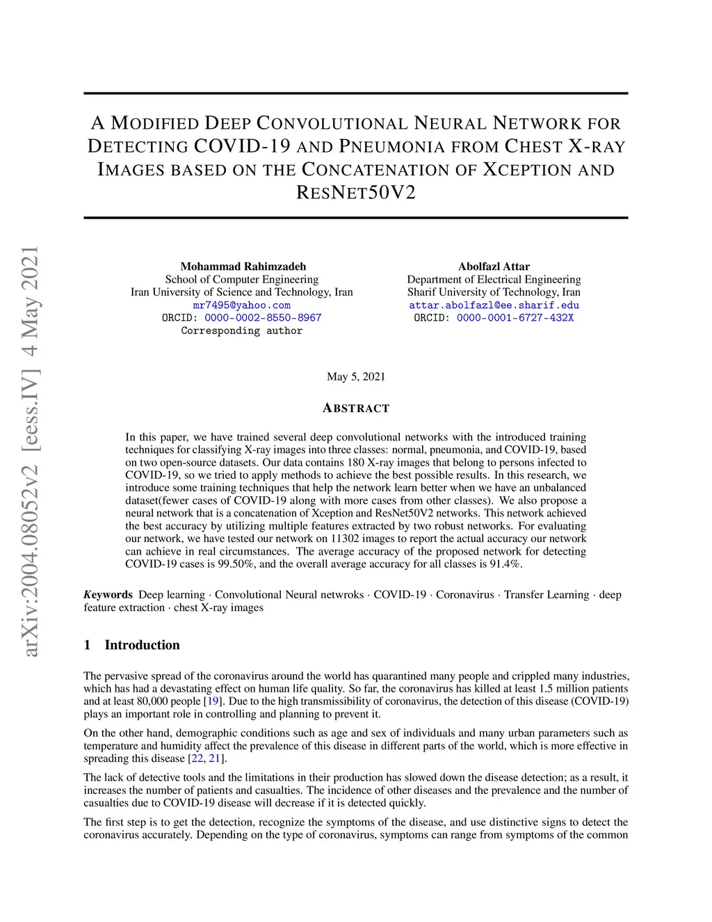 In this paper, we have trained several deep convolutional networks with introduced training techniques for classifying X-ray images into three classes: normal, pneumonia, and COVID-19, based on two open-source datasets. Our data contains 180 X-ray images that belong to persons infected with COVID-19, and we attempted to apply methods to achieve the best possible results. In this research, we introduce some training techniques that help the network learn better when we have an unbalanced dataset (fewer cases of COVID-19 along with more cases from other classes). We also propose a neural network that is a concatenation of the Xception and ResNet50V2 networks. This network achieved the best accuracy by utilizing multiple features extracted by two robust networks. For evaluating our network, we have tested it on 11302 images to report the actual accuracy achievable in real circumstances. The average accuracy of the proposed network for detecting COVID-19 cases is 99.50%, and the overall average accuracy for all classes is 91.4%.