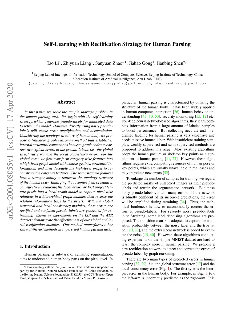 In this paper, we solve the sample shortage problem in the human parsing task. We begin with the self-learning strategy, which generates pseudo-labels for unlabeled data to retrain the model. However, directly using noisy pseudo-labels will cause error amplification and accumulation. Considering the topology structure of human body, we propose a trainable graph reasoning method that establishes internal structural connections between graph nodes to correct two typical errors in the pseudo-labels, i.e., the global structural error and the local consistency error. For the global error, we first transform category-wise features into a high-level graph model with coarse-grained structural information, and then decouple the high-level graph to reconstruct the category features. The reconstructed features have a stronger ability to represent the topology structure of the human body. Enlarging the receptive field of features can effectively reducing the local error. We first project feature pixels into a local graph model to capture pixel-wise relations in a hierarchical graph manner, then reverse the relation information back to the pixels. With the global structural and local consistency modules, these errors are rectified and confident pseudo-labels are generated for retraining. Extensive experiments on the LIP and the ATR datasets demonstrate the effectiveness of our global and local rectification modules. Our method outperforms other state-of-the-art methods in supervised human parsing tasks.