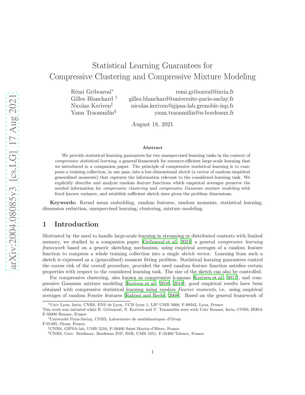 We provide statistical learning guarantees for two unsupervised learning tasks in the context of compressive statistical learning, a general framework for resource-efficient large-scale learning that we introduced in a companion paper. The principle of compressive statistical learning is to compress a training collection, in one pass, into a low-dimensional sketch (a vector of random empirical generalized moments) that captures the information relevant to the considered learning task. We explicit random feature functions which empirical averages preserve the needed information for compressive clustering and compressive Gaussian mixture modeling with fixed known variance, and establish sufficient sketch sizes given the problem dimensions.