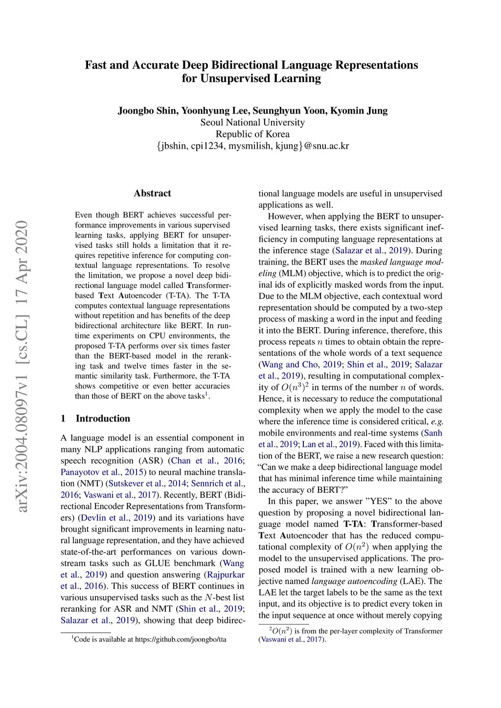 Even though BERT achieves successful performance improvements in various supervised learning tasks, applying BERT for unsupervised tasks still holds a limitation that it requires repetitive inference for computing contextual language representations. To resolve the limitation, we propose a novel deep bidirectional language model called Transformer-based Text Autoencoder (T-TA). The T-TA computes contextual language representations without repetition and has benefits of the deep bidirectional architecture like BERT. In run-time experiments on CPU environments, the proposed T-TA performs over six times faster than the BERT-based model in the reranking task and twelve times faster in the semantic similarity task. Furthermore, the T-TA shows competitive or even better accuracies than those of BERT on the above tasks.