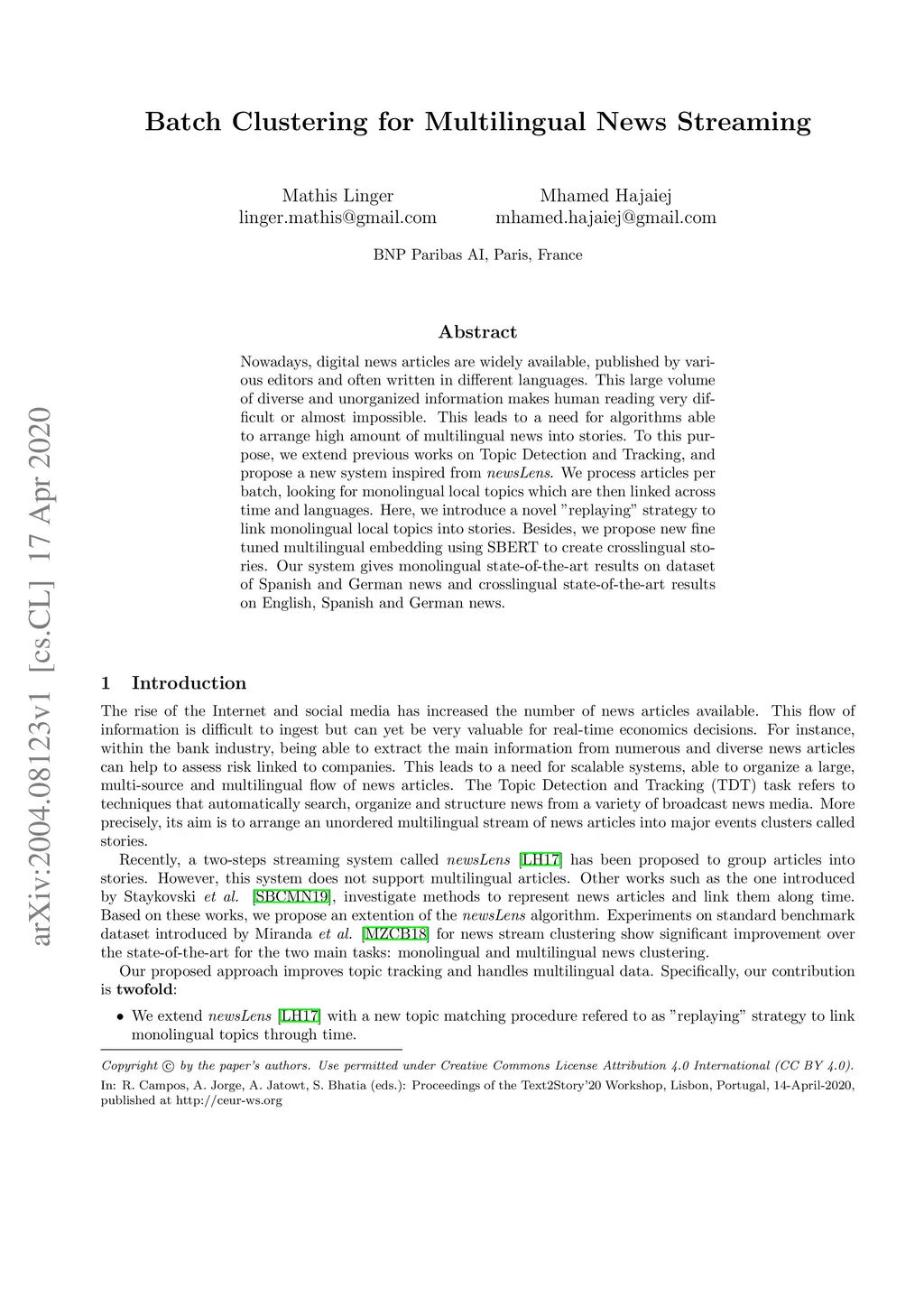 Nowadays, digital news articles are widely available, published by various editors and often written in different languages. This large volume of diverse and unorganized information makes human reading very difficult or almost impossible. This leads to a need for algorithms able to arrange high amount of multilingual news into stories. To this purpose, we extend previous works on Topic Detection and Tracking, and propose a new system inspired from newsLens. We process articles per batch, looking for monolingual local topics which are then linked across time and languages. Here, we introduce a novel "replaying" strategy to link monolingual local topics into stories. Besides, we propose new fine tuned multilingual embedding using SBERT to create crosslingual stories. Our system gives monolingual state-of-the-art results on dataset of Spanish and German news and crosslingual state-of-the-art results on English, Spanish and German news.