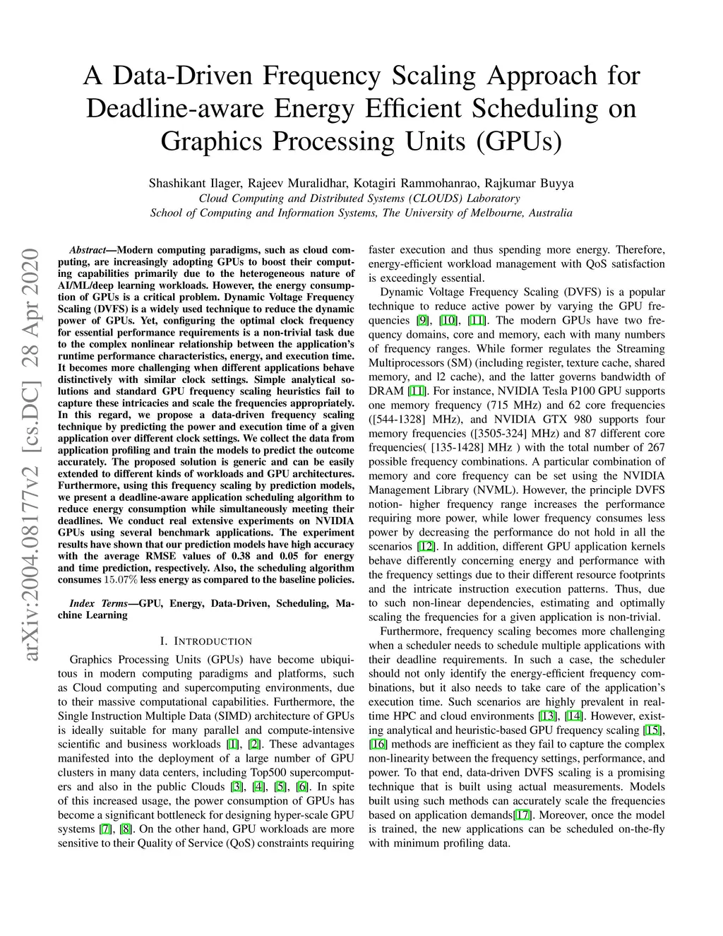 Modern computing paradigms, such as cloud computing, are increasingly adopting GPUs to boost their computing capabilities primarily due to the heterogeneous nature of AI/ML/deep learning workloads. However, the energy consumption of GPUs is a critical problem. Dynamic Voltage Frequency Scaling (DVFS) is a widely used technique to reduce the dynamic power of GPUs. Yet, configuring the optimal clock frequency for essential performance requirements is a non-trivial task due to the complex nonlinear relationship between the application's runtime performance characteristics, energy, and execution time. It becomes more challenging when different applications behave distinctively with similar clock settings. Simple analytical solutions and standard GPU frequency scaling heuristics fail to capture these intricacies and scale the frequencies appropriately. In this regard, we propose a data-driven frequency scaling technique by predicting the power and execution time of a given application over different clock settings. We collect the data from application profiling and train the models to predict the outcome accurately. The proposed solution is generic and can be easily extended to different kinds of workloads and GPU architectures. Furthermore, using this frequency scaling by prediction models, we present a deadline-aware application scheduling algorithm to reduce energy consumption while simultaneously meeting their deadlines. We conduct real extensive experiments on NVIDIA GPUs using several benchmark applications. The experiment results have shown that our prediction models have high accuracy with the average RMSE values of 0.38 and 0.05 for energy and time prediction, respectively. Also, the scheduling algorithm consumes 15.07% less energy as compared to the baseline policies.