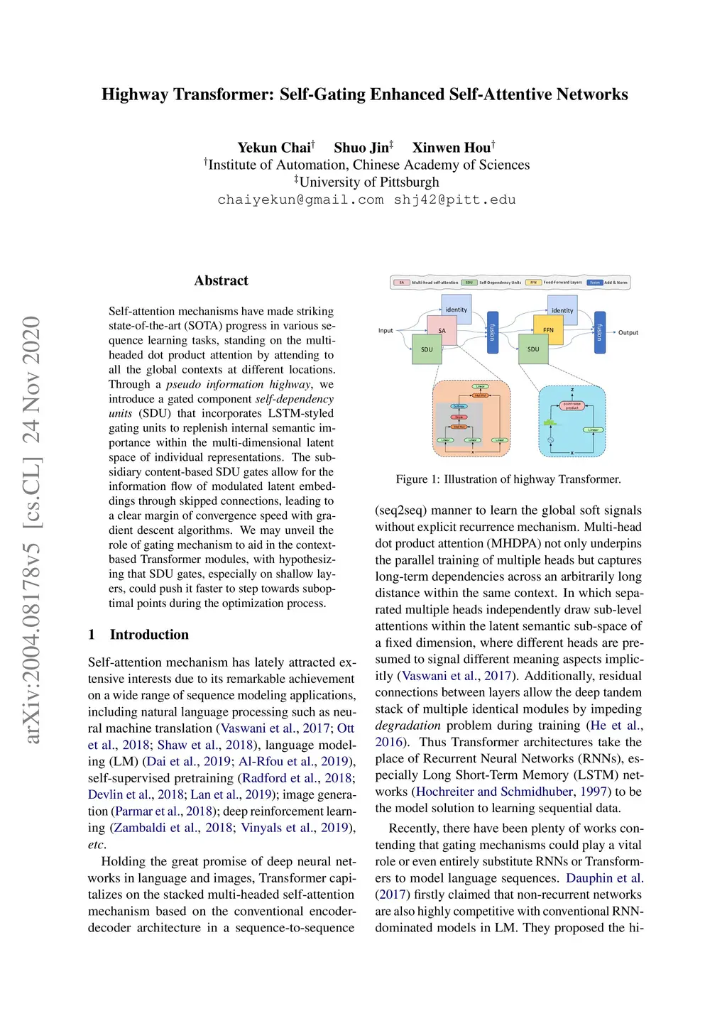Highway Transformer: Self-Gating Enhanced Self-Attentive Networks