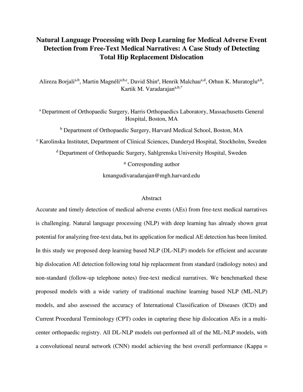 Accurate and timely detection of medical adverse events (AEs) from free-text medical narratives is challenging. Natural language processing (NLP) with deep learning has already shown great potential for analyzing free-text data, but its application for medical AE detection has been limited. In this study we proposed deep learning based NLP (DL-NLP) models for efficient and accurate hip dislocation AE detection following total hip replacement from standard (radiology notes) and non-standard (follow-up telephone notes) free-text medical narratives. We benchmarked these proposed models with a wide variety of traditional machine learning based NLP (ML-NLP) models, and also assessed the accuracy of International Classification of Diseases (ICD) and Current Procedural Terminology (CPT) codes in capturing these hip dislocation AEs in a multi-center orthopaedic registry. All DL-NLP models out-performed all of the ML-NLP models, with a convolutional neural network (CNN) model achieving the best overall performance (Kappa = 0.97 for radiology notes, and Kappa = 1.00 for follow-up telephone notes). On the other hand, the ICD/CPT codes of the patients who sustained a hip dislocation AE were only 75.24% accurate, showing the potential of the proposed model to be used in largescale orthopaedic registries for accurate and efficient hip dislocation AE detection to improve the quality of care and patient outcome.