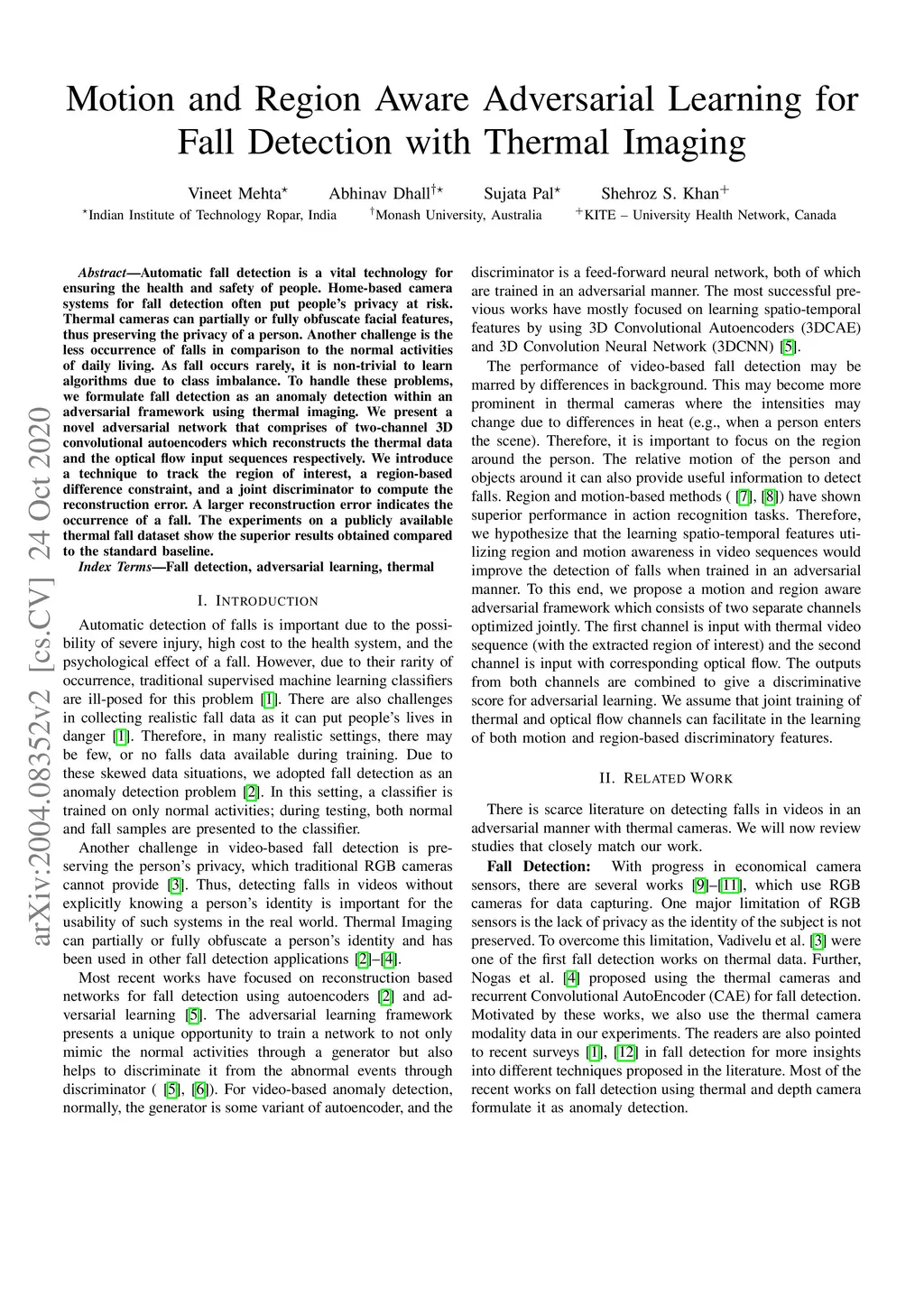 Motion and Region Aware Adversarial Learning for Fall Detection with