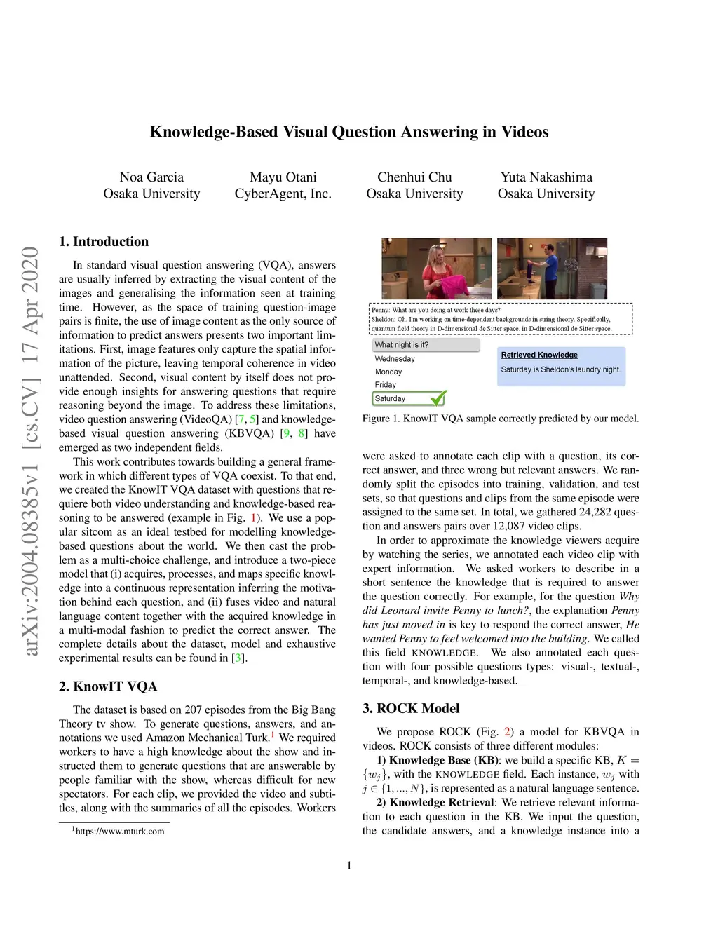 We propose a novel video understanding task by fusing knowledge-based and video question answering. First, we introduce KnowIT VQA, a video dataset with 24,282 human-generated question-answer pairs about a popular sitcom. The dataset combines visual, textual and temporal coherence reasoning together with knowledge-based questions, which need of the experience obtained from the viewing of the series to be answered. Second, we propose a video understanding model by combining the visual and textual video content with specific knowledge about the show. Our main findings are: (i) the incorporation of knowledge produces outstanding improvements for VQA in video, and (ii) the performance on KnowIT VQA still lags well behind human accuracy, indicating its usefulness for studying current video modelling limitations.