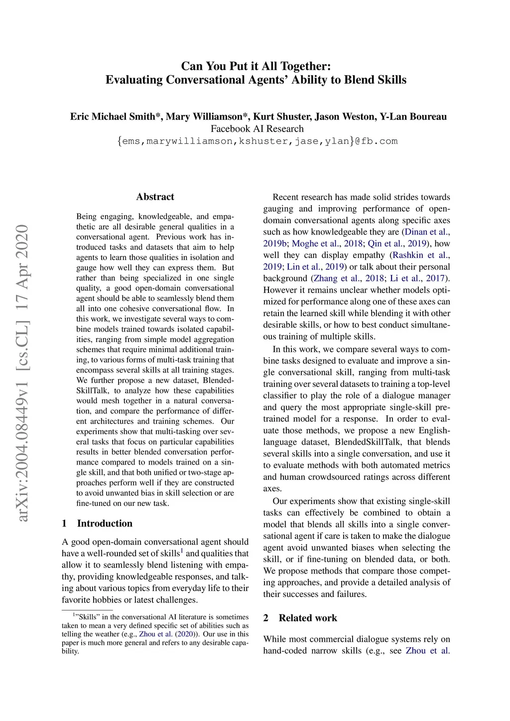 Being engaging, knowledgeable, and empathetic are all desirable general qualities in a conversational agent. Previous work has introduced tasks and datasets that aim to help agents to learn those qualities in isolation and gauge how well they can express them. But rather than being specialized in one single quality, a good open-domain conversational agent should be able to seamlessly blend them all into one cohesive conversational flow. In this work, we investigate several ways to combine models trained towards isolated capabilities, ranging from simple model aggregation schemes that require minimal additional training, to various forms of multi-task training that encompass several skills at all training stages. We further propose a new dataset, BlendedSkillTalk, to analyze how these capabilities would mesh together in a natural conversation, and compare the performance of different architectures and training schemes. Our experiments show that multi-tasking over several tasks that focus on particular capabilities results in better blended conversation performance compared to models trained on a single skill, and that both unified or two-stage approaches perform well if they are constructed to avoid unwanted bias in skill selection or are fine-tuned on our new task.