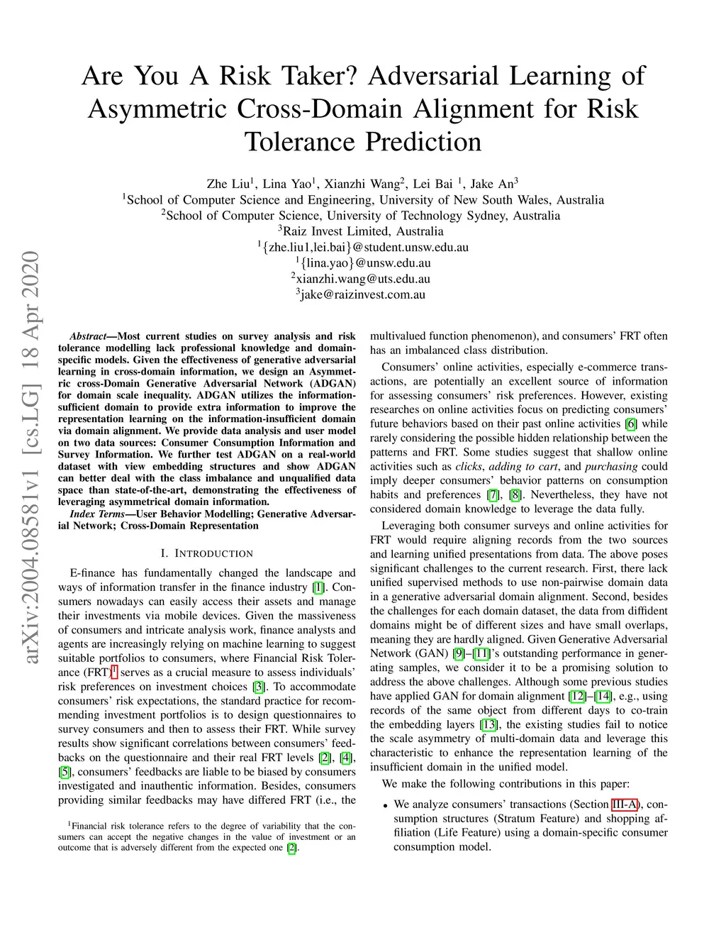 Most current studies on survey analysis and risk tolerance modelling lack professional knowledge and domain-specific models. Given the effectiveness of generative adversarial learning in cross-domain information, we design an Asymmetric cross-Domain Generative Adversarial Network (ADGAN) for domain scale inequality. ADGAN utilizes the information-sufficient domain to provide extra information to improve the representation learning on the information-insufficient domain via domain alignment. We provide data analysis and user model on two data sources: Consumer Consumption Information and Survey Information. We further test ADGAN on a real-world dataset with view embedding structures and show ADGAN can better deal with the class imbalance and unqualified data space than state-of-the-art, demonstrating the effectiveness of leveraging asymmetrical domain information.