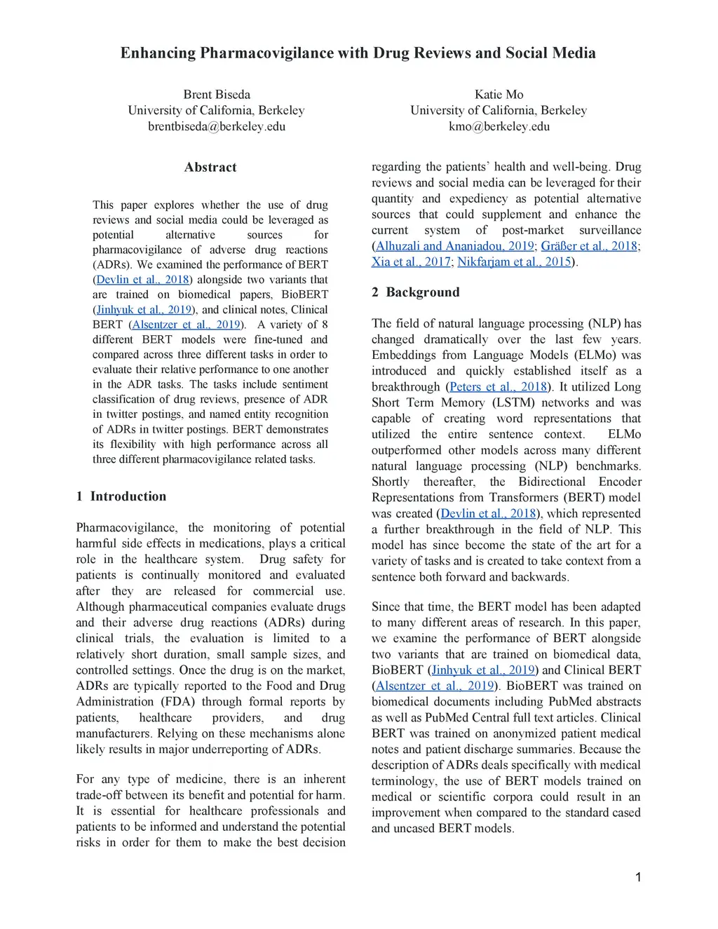 This paper explores whether the use of drug reviews and social media could be leveraged as potential alternative sources for pharmacovigilance of adverse drug reactions (ADRs). We examined the performance of BERT alongside two variants that are trained on biomedical papers, BioBERT7, and clinical notes, Clinical BERT8. A variety of 8 different BERT models were fine-tuned and compared across three different tasks in order to evaluate their relative performance to one another in the ADR tasks. The tasks include sentiment classification of drug reviews, presence of ADR in twitter postings, and named entity recognition of ADRs in twitter postings. BERT demonstrates its flexibility with high performance across all three different pharmacovigilance related tasks.