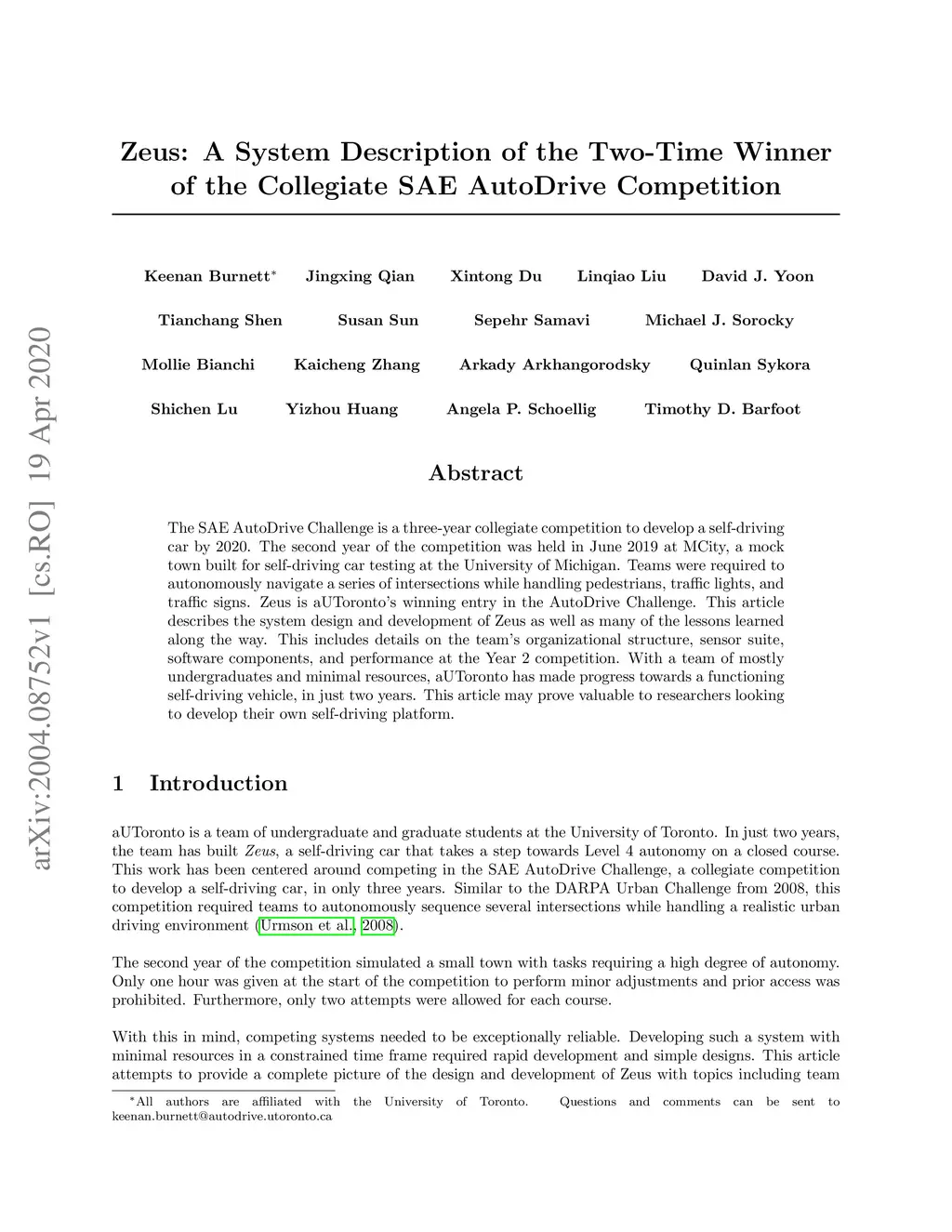 The SAE AutoDrive Challenge is a three-year collegiate competition to develop a self-driving car by 2020. The second year of the competition was held in June 2019 at MCity, a mock town built for self-driving car testing at the University of Michigan. Teams were required to autonomously navigate a series of intersections while handling pedestrians, traffic lights, and traffic signs. Zeus is aUToronto's winning entry in the AutoDrive Challenge. This article describes the system design and development of Zeus as well as many of the lessons learned along the way. This includes details on the team's organizational structure, sensor suite, software components, and performance at the Year 2 competition. With a team of mostly undergraduates and minimal resources, aUToronto has made progress towards a functioning self-driving vehicle, in just two years. This article may prove valuable to researchers looking to develop their own self-driving platform.