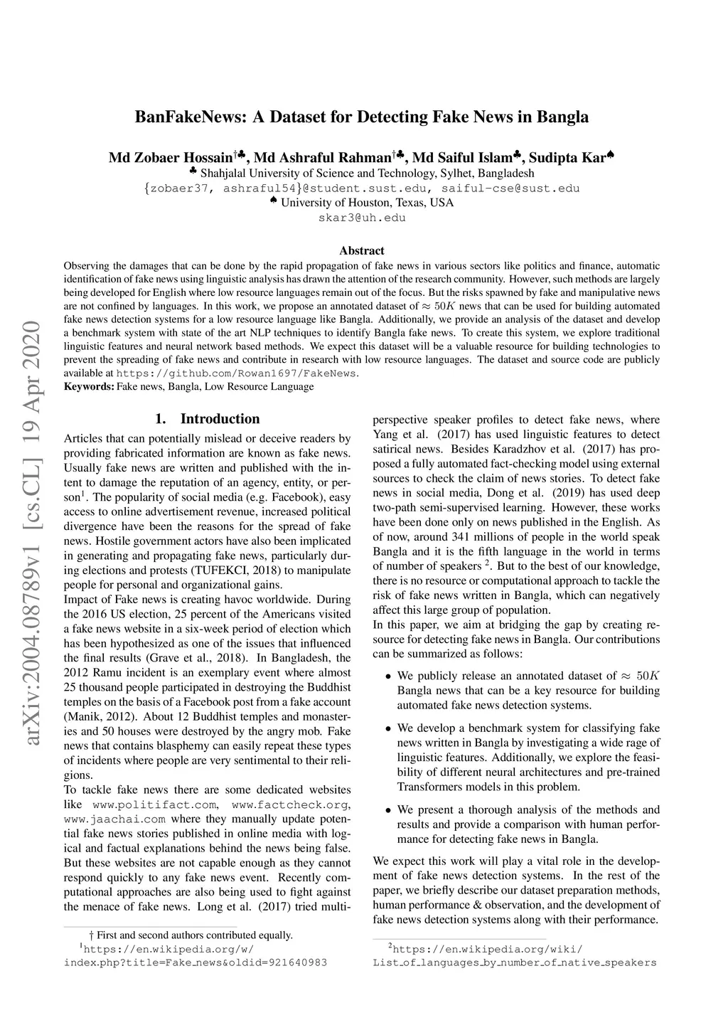 BanFakeNews: A Dataset for Detecting Fake News in Bangla