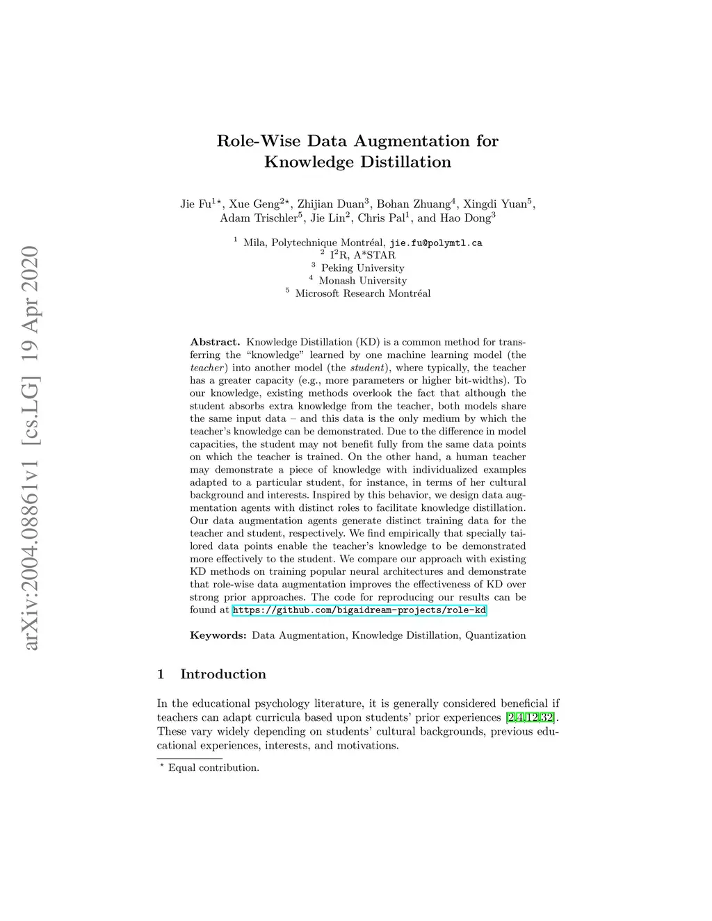 Role-Wise Data Augmentation for Knowledge Distillation