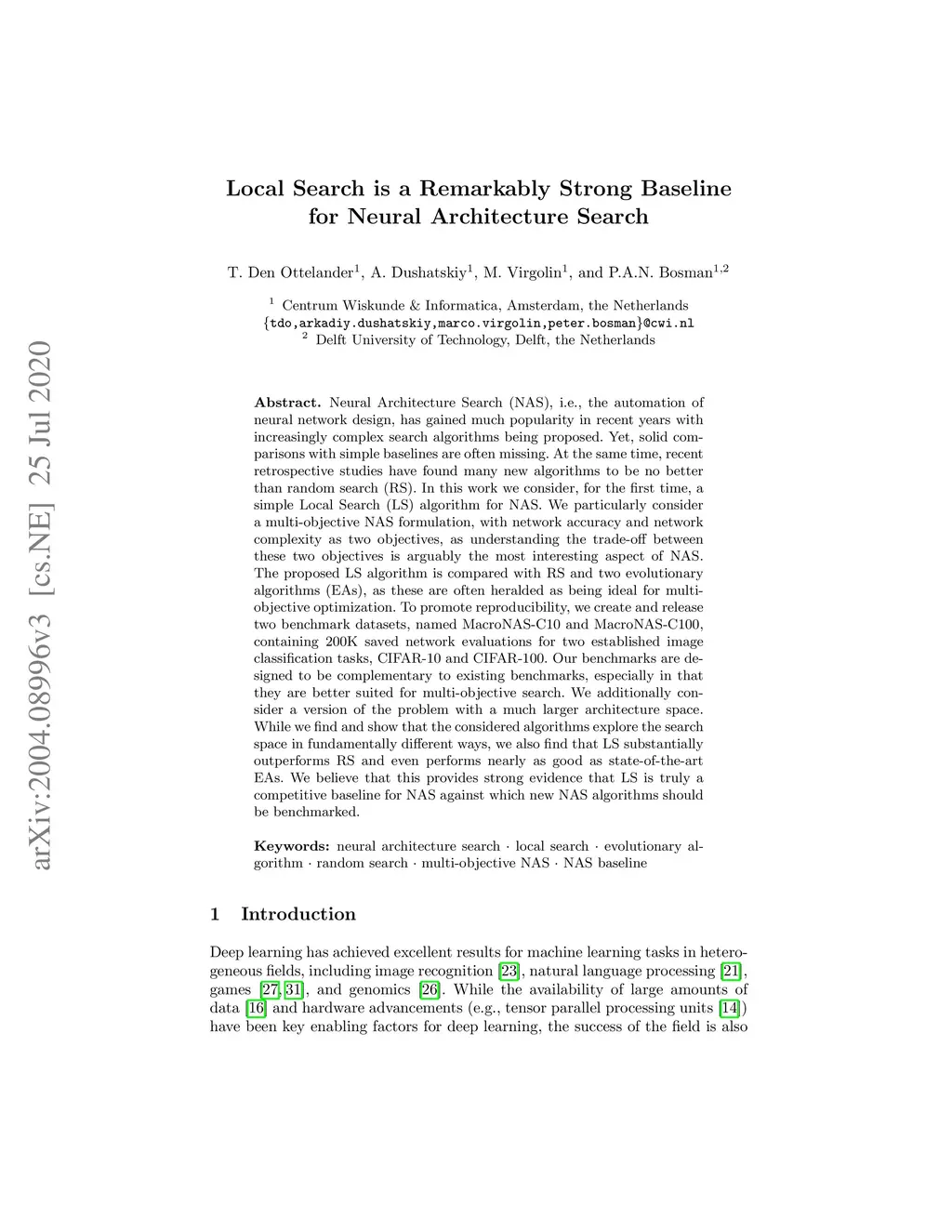 Neural Architecture Search (NAS), i.e., the automation of neural network design, has gained much popularity in recent years with increasingly complex search algorithms being proposed. Yet, solid comparisons with simple baselines are often missing. At the same time, recent retrospective studies have found many new algorithms to be no better than random search (RS). In this work we consider, for the first time, a simple Local Search (LS) algorithm for NAS. We particularly consider a multi-objective NAS formulation, with network accuracy and network complexity as two objectives, as understanding the trade-off between these two objectives is arguably the most interesting aspect of NAS. The proposed LS algorithm is compared with RS and two evolutionary algorithms (EAs), as these are often heralded as being ideal for multi-objective optimization. To promote reproducibility, we create and release two benchmark datasets, named MacroNAS-C10 and MacroNAS-C100, containing 200K saved network evaluations for two established image classification tasks, CIFAR-10 and CIFAR-100. Our benchmarks are designed to be complementary to existing benchmarks, especially in that they are better suited for multi-objective search. We additionally consider a version of the problem with a much larger architecture space. While we find and show that the considered algorithms explore the search space in fundamentally different ways, we also find that LS substantially outperforms RS and even performs nearly as good as state-of-the-art EAs. We believe that this provides strong evidence that LS is truly a competitive baseline for NAS against which new NAS algorithms should be benchmarked.