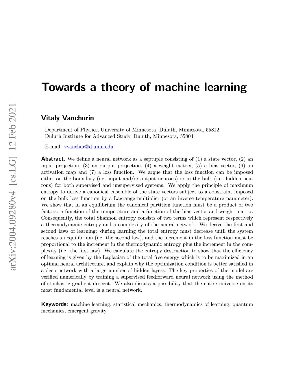 We define a neural network as a septuple consisting of (1) a state vector, (2) an input projection, (3) an output projection, (4) a weight matrix, (5) a bias vector, (6) an activation map and (7) a loss function. We argue that the loss function can be imposed either on the boundary (i.e. input and/or output neurons) or in the bulk (i.e. hidden neurons) for both supervised and unsupervised systems. We apply the principle of maximum entropy to derive a canonical ensemble of the state vectors subject to a constraint imposed on the bulk loss function by a Lagrange multiplier (or an inverse temperature parameter). We show that in an equilibrium the canonical partition function must be a product of two factors: a function of the temperature and a function of the bias vector and weight matrix. Consequently, the total Shannon entropy consists of two terms which represent respectively a thermodynamic entropy and a complexity of the neural network. We derive the first and second laws of learning: during learning the total entropy must decrease until the system reaches an equilibrium (i.e. the second law), and the increment in the loss function must be proportional to the increment in the thermodynamic entropy plus the increment in the complexity (i.e. the first law). We calculate the entropy destruction to show that the efficiency of learning is given by the Laplacian of the total free energy which is to be maximized in an optimal neural architecture, and explain why the optimization condition is better satisfied in a deep network with a large number of hidden layers. The key properties of the model are verified numerically by training a supervised feedforward neural network using the method of stochastic gradient descent. We also discuss a possibility that the entire universe on its most fundamental level is a neural network.