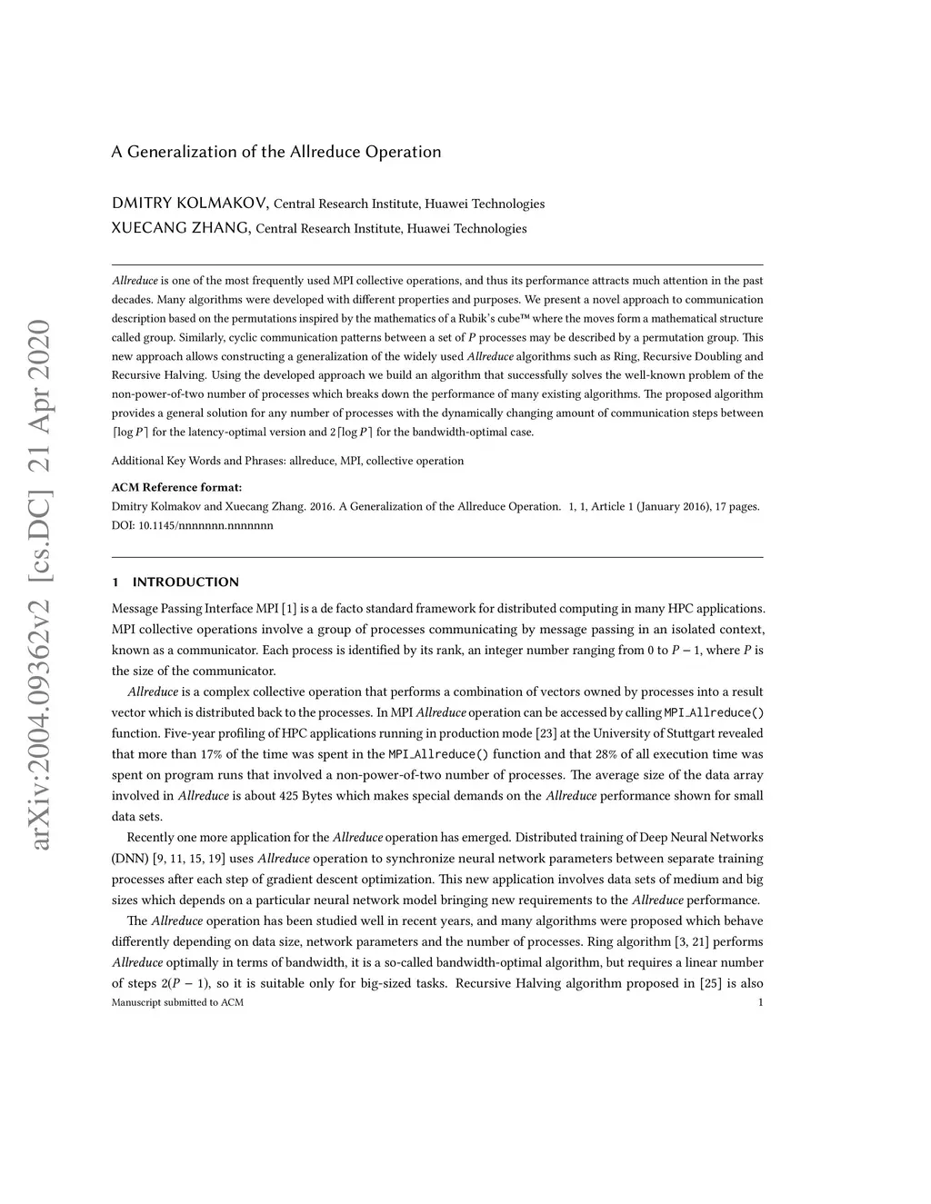 Allreduce is one of the most frequently used MPI collective operations, and thus its performance attracts much attention in the past decades. Many algorithms were developed with different properties and purposes. We present a novel approach to communication description based on the permutations inspired by the mathematics of a Rubik's cube where the moves form a mathematical structure called group. Similarly, cyclic communication patterns between a set of processes may be described by a permutation group. This new approach allows constructing a generalization of the widely used Allreduce algorithms such as Ring, Recursive Doubling and Recursive Halving. Using the developed approach we build an algorithm that successfully solves the well-known problem of the non-power-of-two number of processes which breaks down the performance of many existing algorithms. The proposed algorithm provides a general solution for any number of processes with the dynamically changing amount of communication steps between for the latency-optimal version and for the bandwidth-optimal case.