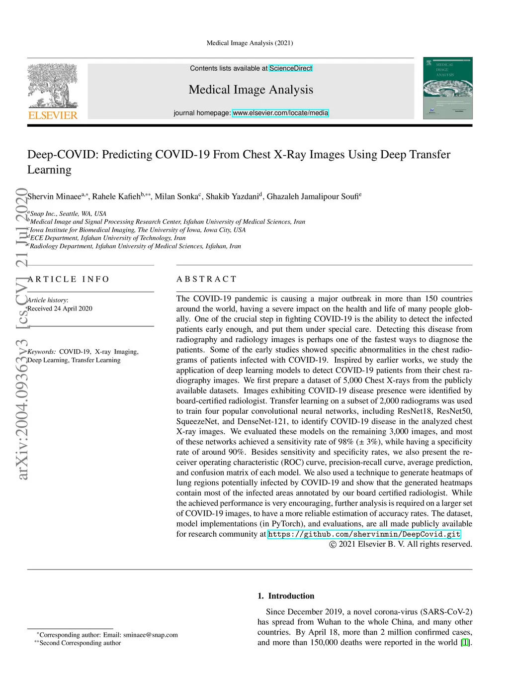 The COVID-19 pandemic is causing a major outbreak in more than 150 countries around the world, having a severe impact on the health and life of many people globally. One of the crucial step in fighting COVID-19 is the ability to detect the infected patients early enough, and put them under special care. Detecting this disease from radiography and radiology images is perhaps one of the fastest ways to diagnose the patients. Some of the early studies showed specific abnormalities in the chest radiograms of patients infected with COVID-19. Inspired by earlier works, we study the application of deep learning models to detect COVID-19 patients from their chest radiography images. We first prepare a dataset of 5,000 Chest X-rays from the publicly available datasets. Images exhibiting COVID-19 disease presence were identified by board-certified radiologist. Transfer learning on a subset of 2,000 radiograms was used to train four popular convolutional neural networks, including ResNet18, ResNet50, SqueezeNet, and DenseNet-121, to identify COVID-19 disease in the analyzed chest X-ray images. We evaluated these models on the remaining 3,000 images, and most of these networks achieved a sensitivity rate of 98% ( 3%), while having a specificity rate of around 90%. Besides sensitivity and specificity rates, we also present the receiver operating characteristic (ROC) curve, precision-recall curve, average prediction, and confusion matrix of each model. We also used a technique to generate heatmaps of lung regions potentially infected by COVID-19 and show that the generated heatmaps contain most of the infected areas annotated by our board certified radiologist. While the achieved performance is very encouraging, further analysis is required on a larger set of COVID-19 images, to have a more reliable estimation of accuracy rates. The dataset, model implementations (in PyTorch), and evaluations, are all made publicly available for research community at https://github.com/shervinmin/DeepCovid.git
