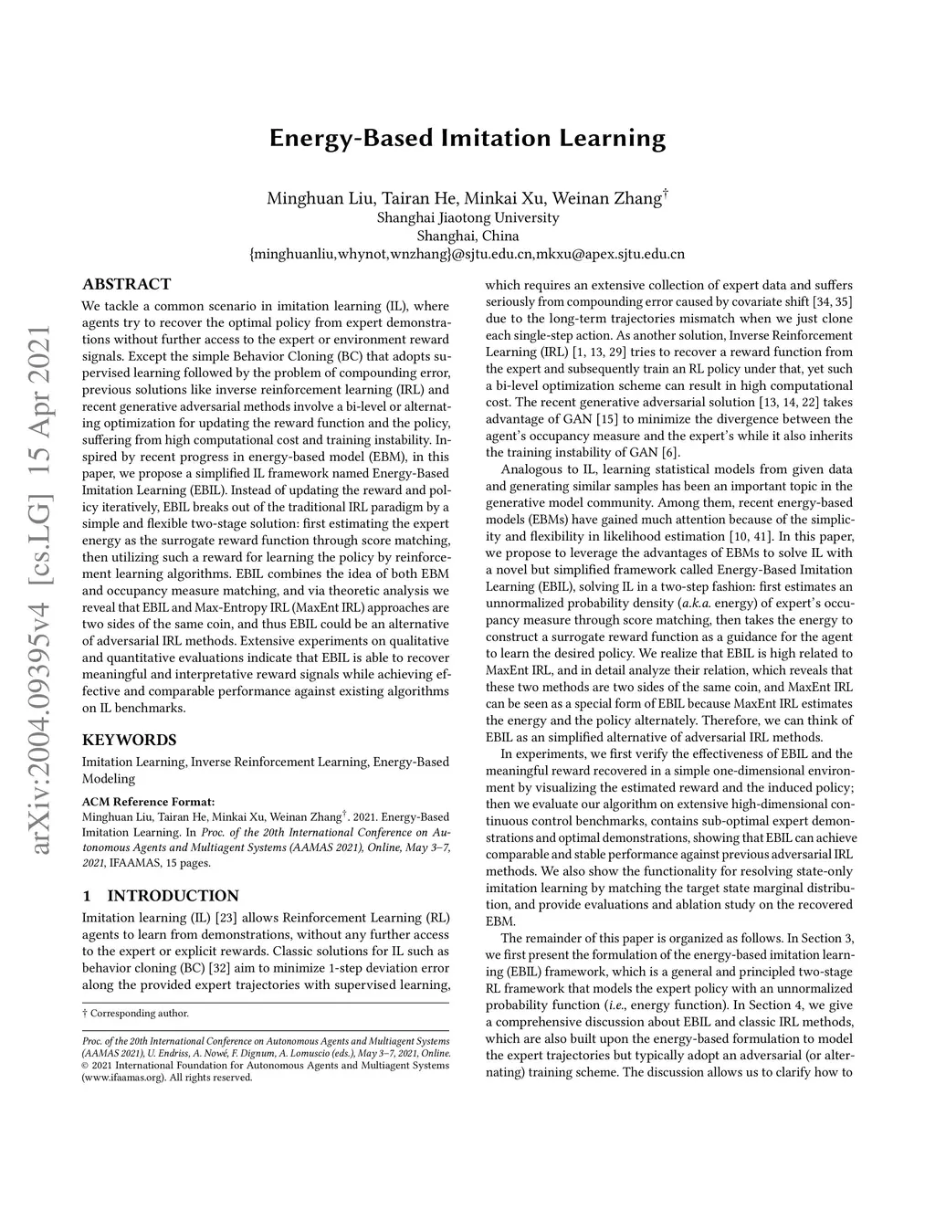 We tackle a common scenario in imitation learning (IL), where agents try to recover the optimal policy from expert demonstrations without further access to the expert or environment reward signals. Except the simple Behavior Cloning (BC) that adopts supervised learning followed by the problem of compounding error, previous solutions like inverse reinforcement learning (IRL) and recent generative adversarial methods involve a bi-level or alternating optimization for updating the reward function and the policy, suffering from high computational cost and training instability. Inspired by recent progress in energy-based model (EBM), in this paper, we propose a simplified IL framework named Energy-Based Imitation Learning (EBIL). Instead of updating the reward and policy iteratively, EBIL breaks out of the traditional IRL paradigm by a simple and flexible two-stage solution: first estimating the expert energy as the surrogate reward function through score matching, then utilizing such a reward for learning the policy by reinforcement learning algorithms. EBIL combines the idea of both EBM and occupancy measure matching, and via theoretic analysis we reveal that EBIL and Max-Entropy IRL (MaxEnt IRL) approaches are two sides of the same coin, and thus EBIL could be an alternative of adversarial IRL methods. Extensive experiments on qualitative and quantitative evaluations indicate that EBIL is able to recover meaningful and interpretative reward signals while achieving effective and comparable performance against existing algorithms on IL benchmarks.