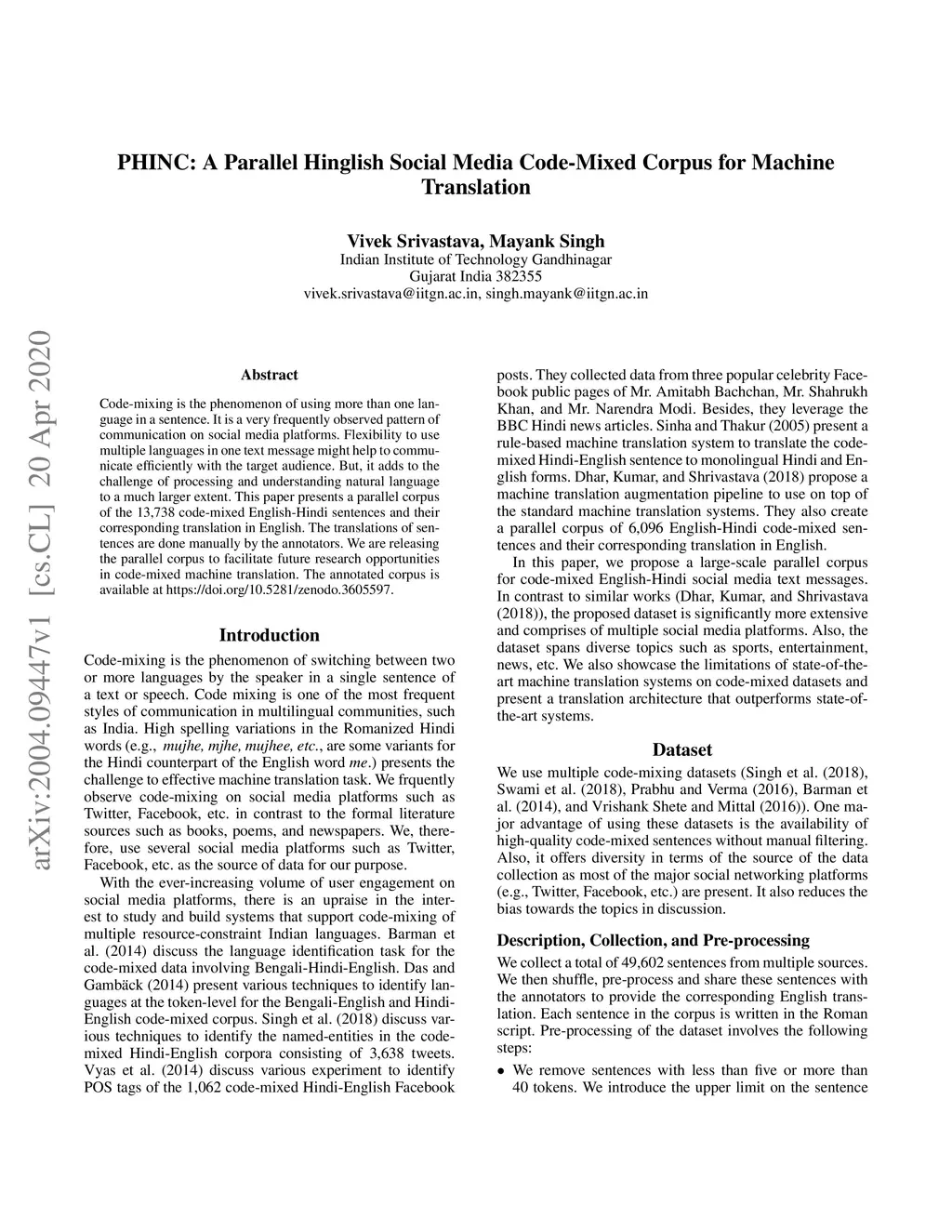 PHINC: A Parallel Hinglish Social Media Code-Mixed Corpus for Machine