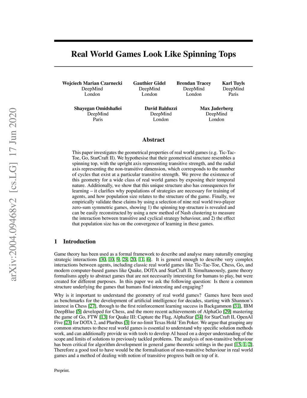 This paper investigates the geometrical properties of real world games (e.g. Tic-Tac-Toe, Go, StarCraft II). We hypothesise that their geometrical structure resemble a spinning top, with the upright axis representing transitive strength, and the radial axis, which corresponds to the number of cycles that exist at a particular transitive strength, representing the non-transitive dimension. We prove the existence of this geometry for a wide class of real world games, exposing their temporal nature. Additionally, we show that this unique structure also has consequences for learning - it clarifies why populations of strategies are necessary for training of agents, and how population size relates to the structure of the game. Finally, we empirically validate these claims by using a selection of nine real world two-player zero-sum symmetric games, showing 1) the spinning top structure is revealed and can be easily re-constructed by using a new method of Nash clustering to measure the interaction between transitive and cyclical strategy behaviour, and 2) the effect that population size has on the convergence in these games.