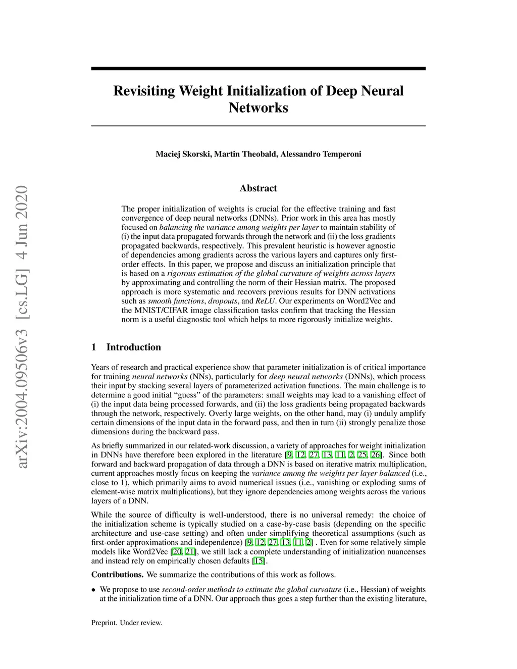 The proper initialization of weights is crucial for the effective training and fast convergence of deep neural networks (DNNs). Prior work in this area has mostly focused on balancing the variance among weights per layer to maintain stability of (i) the input data propagated forwards through the network and (ii) the loss gradients propagated backwards, respectively. This prevalent heuristic is however agnostic of dependencies among gradients across the various layers and captures only firstorder effects. In this paper, we propose and discuss an initialization principle that is based on a rigorous estimation of the global curvature of weights across layers by approximating and controlling the norm of their Hessian matrix. The proposed approach is more systematic and recovers previous results for DNN activations such as smooth functions, dropouts, and ReLU. Our experiments on Word2Vec and the MNIST/CIFAR image classification tasks confirm that tracking the Hessian norm is a useful diagnostic tool which helps to more rigorously initialize weights